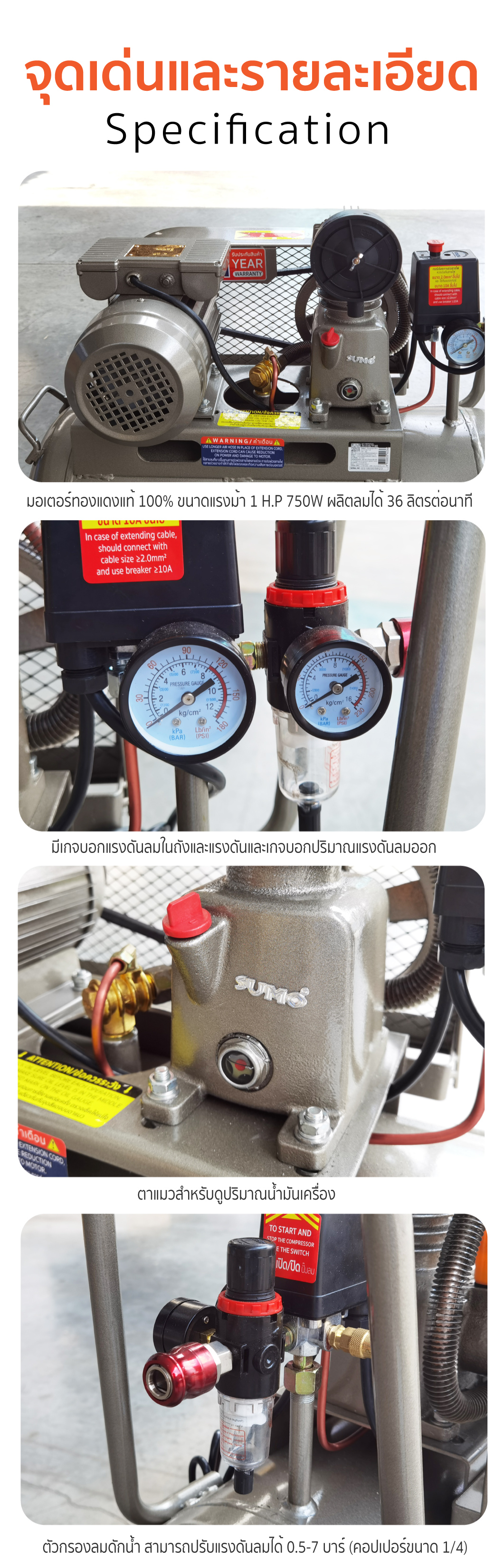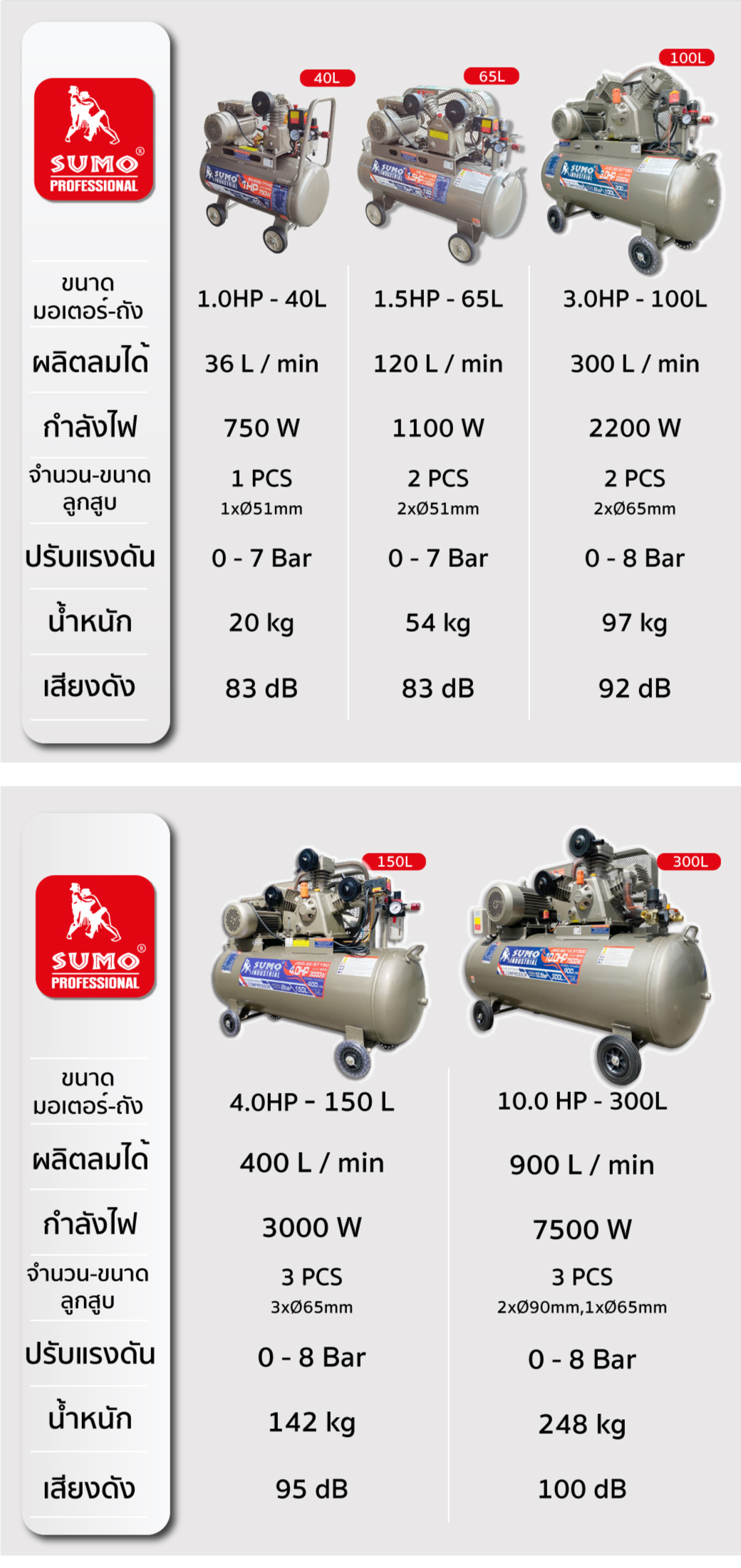 - ผลิตลมได้เร็ว ลมเต็มถังภายใน 3.50 นาที (0-7 bar) ถังเก็บลมขนาด 40 ลิตร