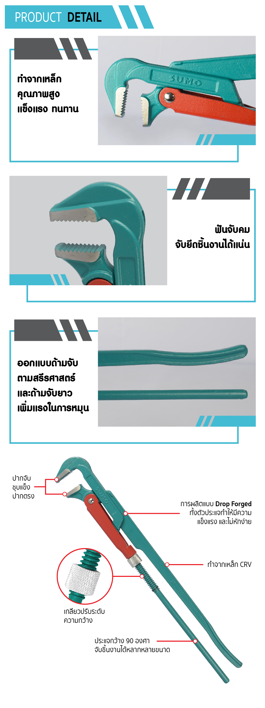 ประแจกว้าง 90 องศา จับชิ้นงานได้หลากหลายขนาด ด้ามจับกระชับมือ