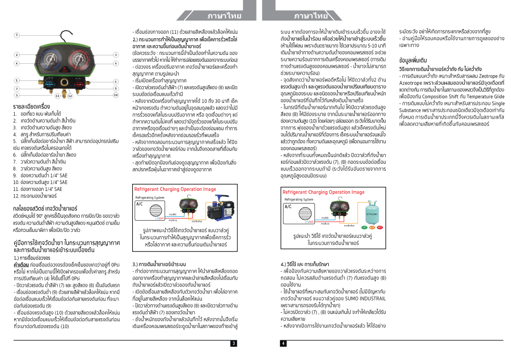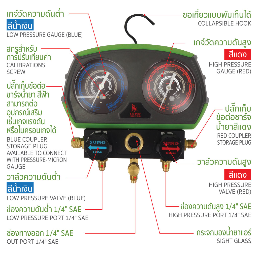 ใช้วัดแรงดันของเหลว และ ก๊าซ ภายในระบบทำความเย็น ในกระบวนการสุญญากาศ และ เติมน้ำยาแอร์