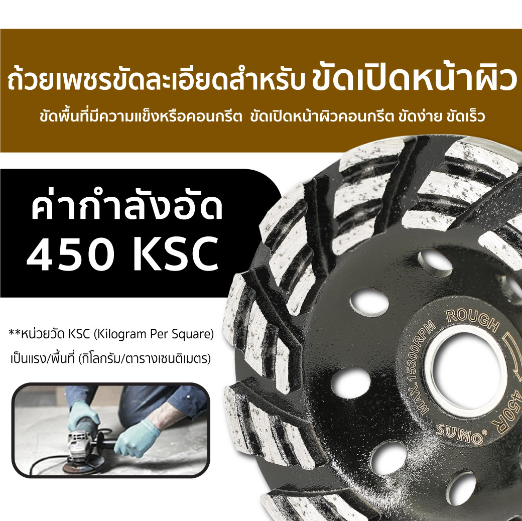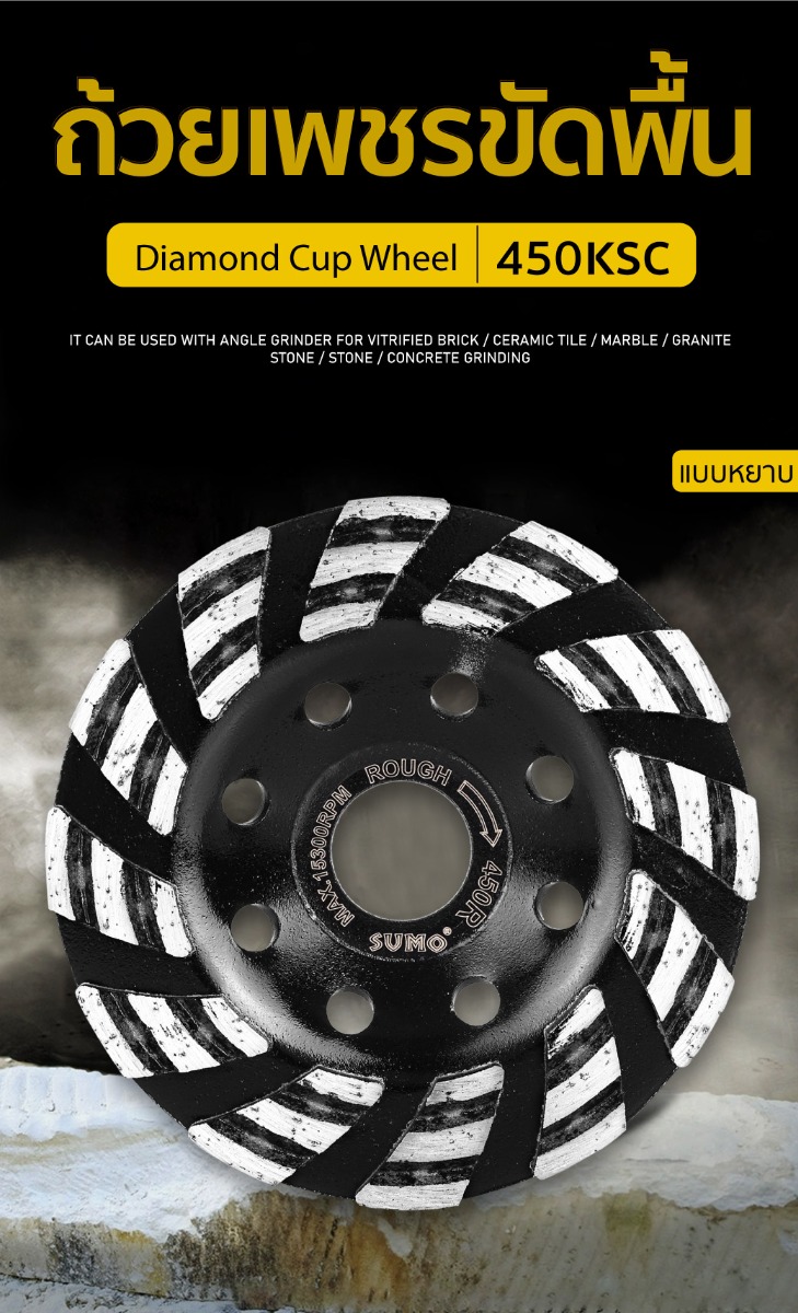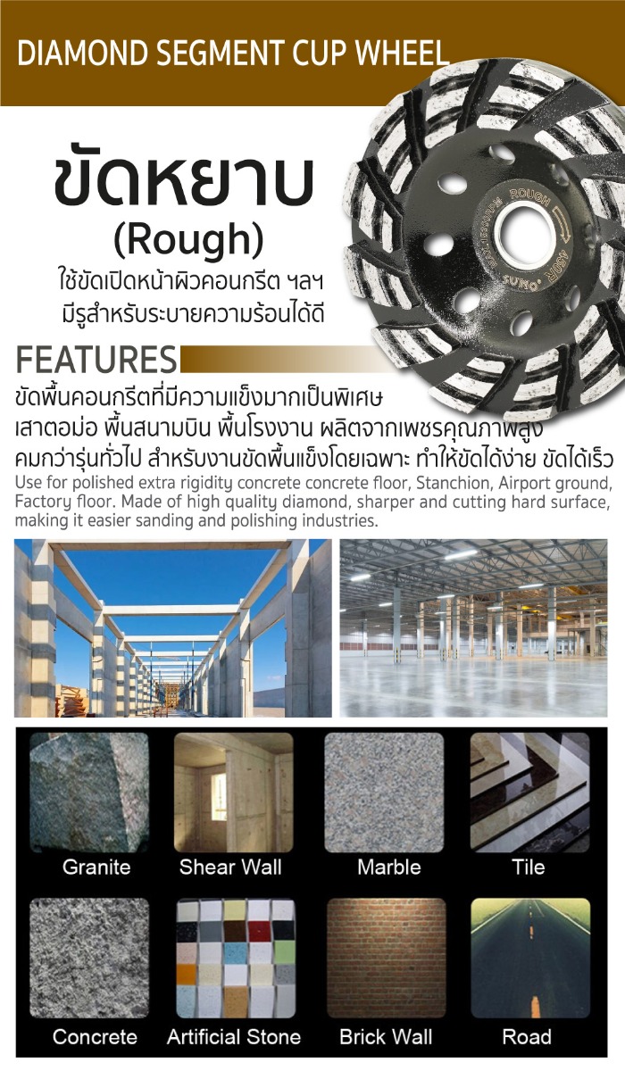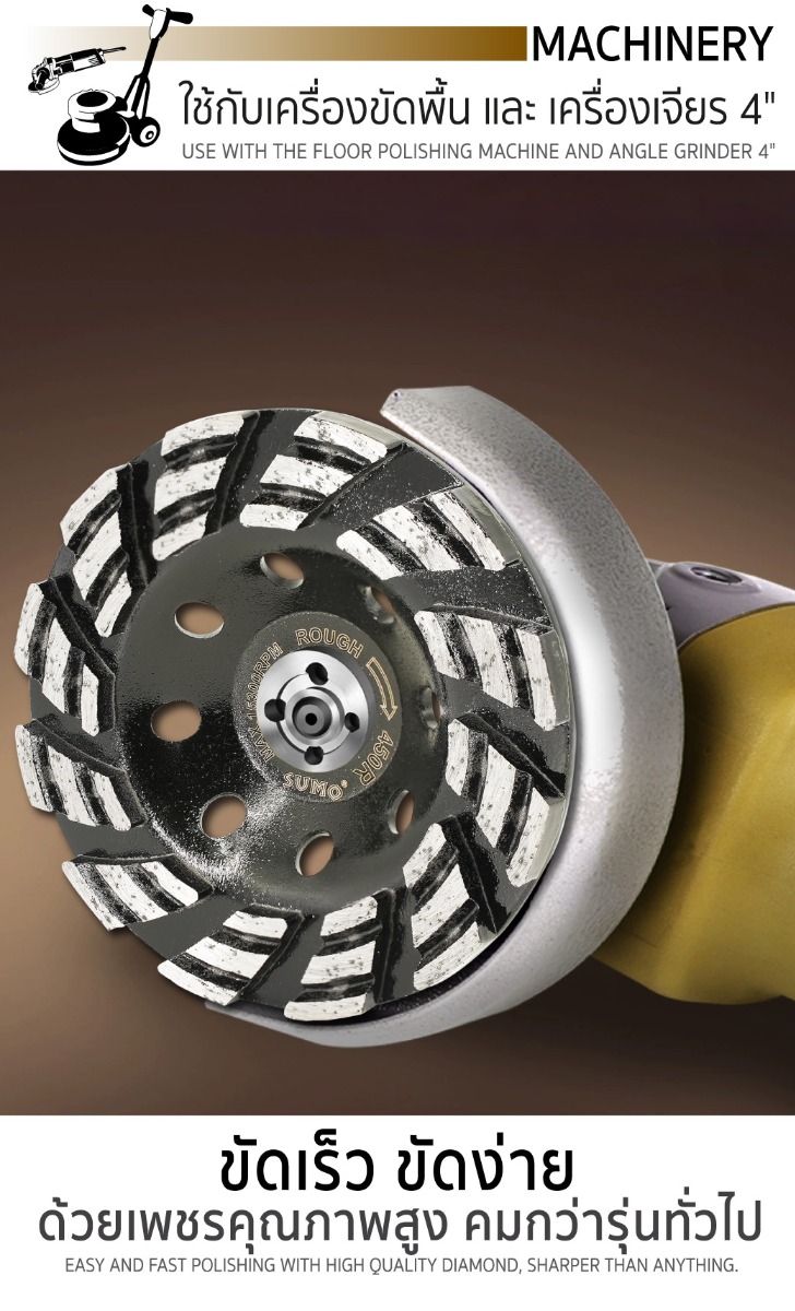 - ผลิตจากเพชรคุณภาพสูง คมกว่าทั่วไป สำหรับงานขัดพื้นแข็งโดยเฉพาะทำให้ขัดได้ง่าย ขัดได้เร็ว