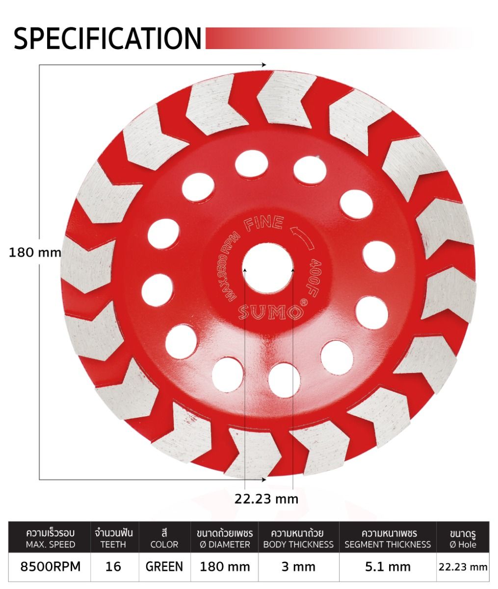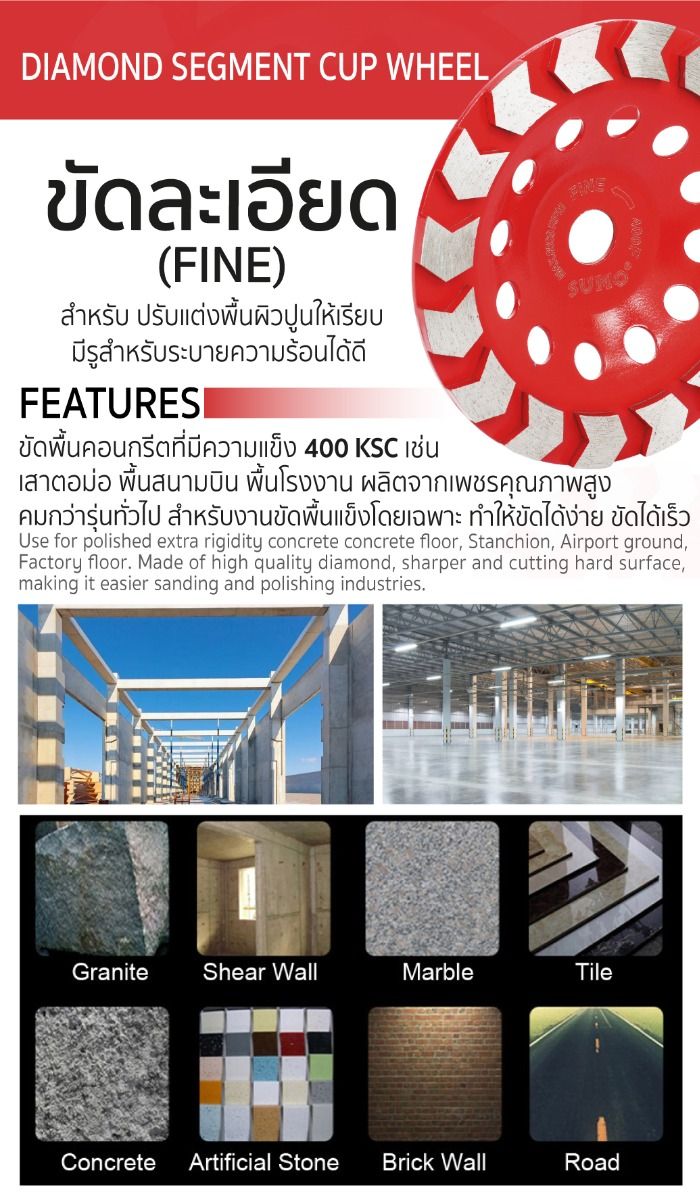 - ผลิตจากเพชรคุณภาพสูง คมกว่าทั่วไป สำหรับงานขัดพื้นแข็งโดยเฉพาะทำให้ขัดได้ง่าย ขัดได้เร็ว