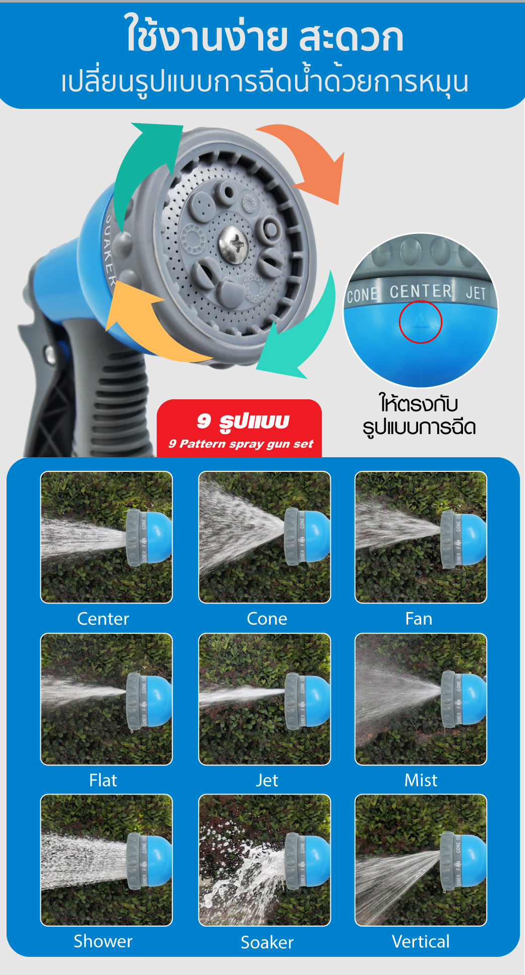 - ชุดหัวฉีดน้ำปรับได้ 9 ระดับ MIST, SOAKER, FLAT, VERTICAL, SHOWER, FAN, CONE, CENTER, SET เพียงต่อกับสายยางก็สามารถใช้งานได้ทันที