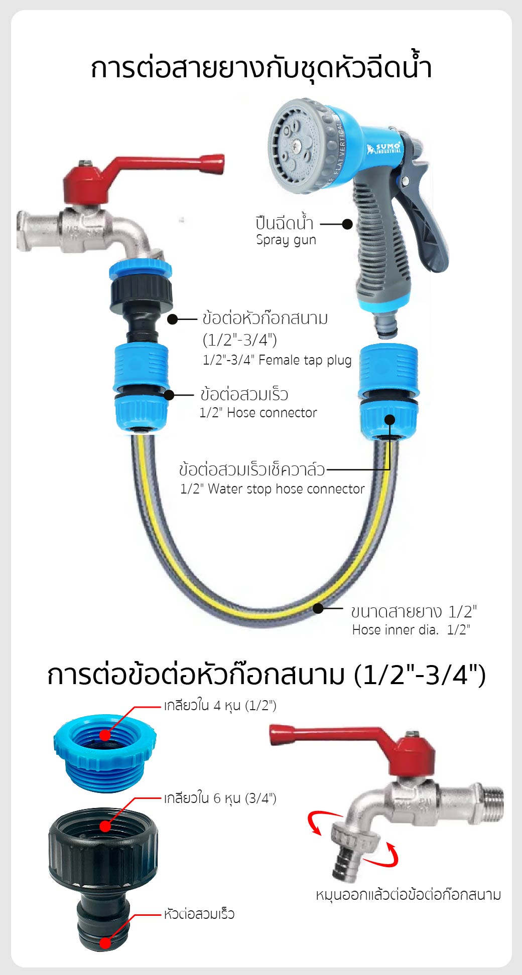 - ชุดหัวฉีดน้ำมาพร้อม ข้อต่อหัวก๊อกสนาม 1/2"-3/4", ข้อต่อสวมเร็วเช็ควาล์ว 1/2", ข้อต่อสวมเร็ว 1/2"