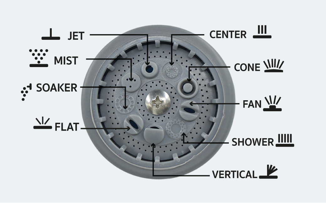 - Nine watering patterns switchable: MIST, SOAKER, FLAT, VERTICAL, SHOWER, FAN, CONE, CENTER, SET Just connect with hose it can be use.