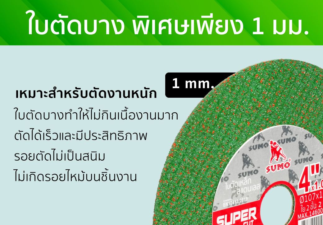- ใบตัดขนาดบางพิเศษ เพียง 1 มม. ทำให้ตัดได้เร็ว รอยตัดไม่เป็นสนิม ไม่เกิดรอยไหม้บนชิ้นงาน