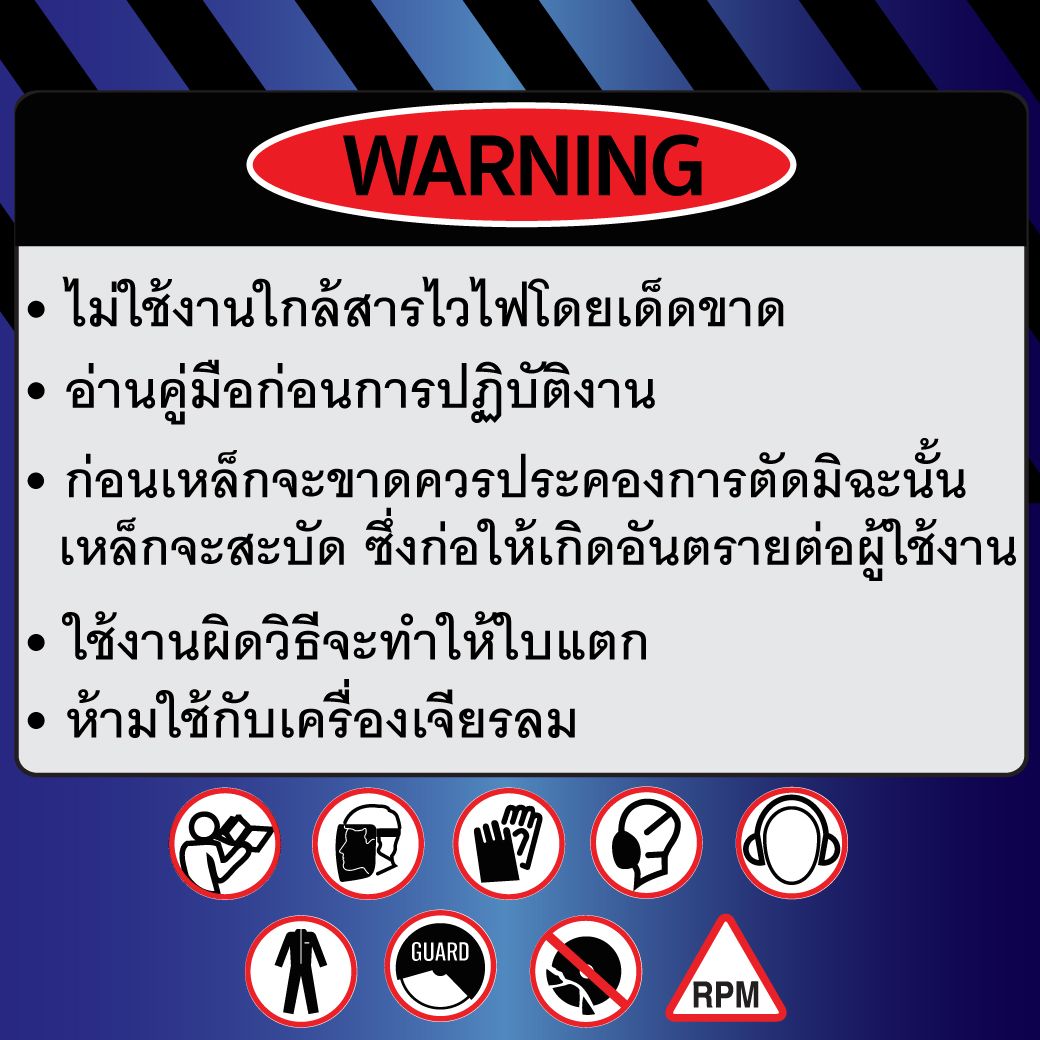 - สำหรับสินค้าประเภทใบตัด จะมีข้อแนะนำด้านความปลอดภัย คำเตือน และข้อจำกัดการใช้งานแสดงบนฉลากสินค้าอยู่แล้ว แต่เนื่องจากฉลากบนสินค้ามีพื้นที่จำกัด จึงไม่สามารถใส่รายละเอียดทั้งหมดลงไปได้ ดังนั้นผู้ใช้งาน จำเป็นต้องอ่านและปฏิบัติตามข้อแนะนำทั้งหมดที่อยู่บนฉลาก กล่องและลังของสินค้าให้ละเอียดครบถ้วนก่อนการใช้งาน