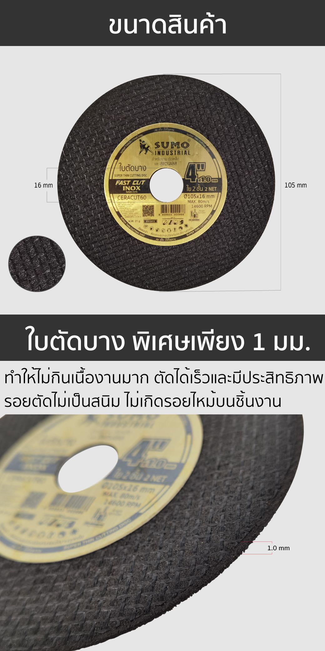 - ขนาดใบตัดบางเป็นพิเศษเพียง 1 มม. ทำให้ไม่กินเนื้องานมาก ตัดเร็ว ตัดไว อย่างมีประสิทธิภาพ รอยตัดไม่เป็นสนิม ไม่เกิดรอยไหม้บนชิ้นงาน
