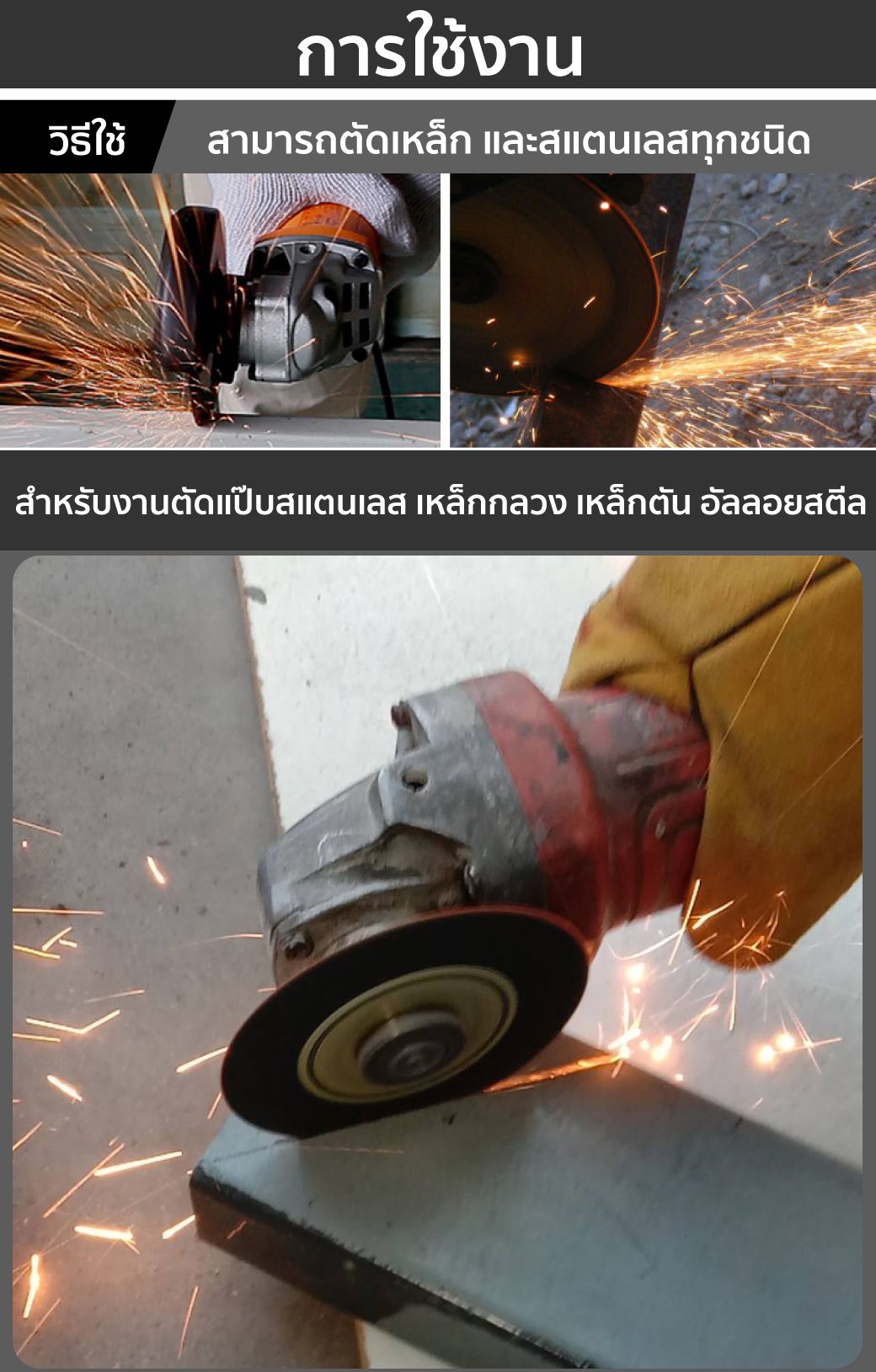 - ใช้ตัดวัสดุสแตนเลส เหล็กกลวง เหล็กตัน และอัลลอยสตีล