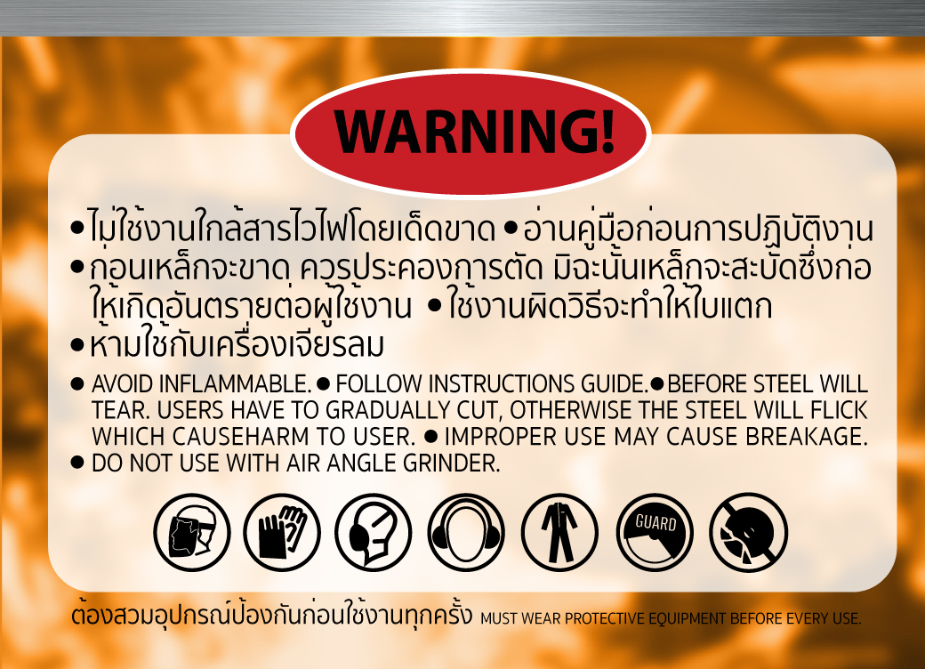 • สำหรับสินค้าประเภทใบตัด จะมีข้อแนะนำด้านความปลอดภัย คำเตือน และข้อจำกัดการใช้งานแสดงบนฉลากสินค้าอยู่แล้ว แต่เนื่องจากฉลากบนสินค้ามีพื้นที่จำกัด จึงไม่สามารถใส่รายละเอียดทั้งหมดลงไปได้ ดังนั้นผู้ใช้งาน จำเป็นต้องอ่านและปฏิบัติตามข้อแนะนำทั้งหมดที่อยู่บนฉลาก กล่องและลังของสินค้าให้ละเอียดครบถ้วนก่อนการใช้งาน