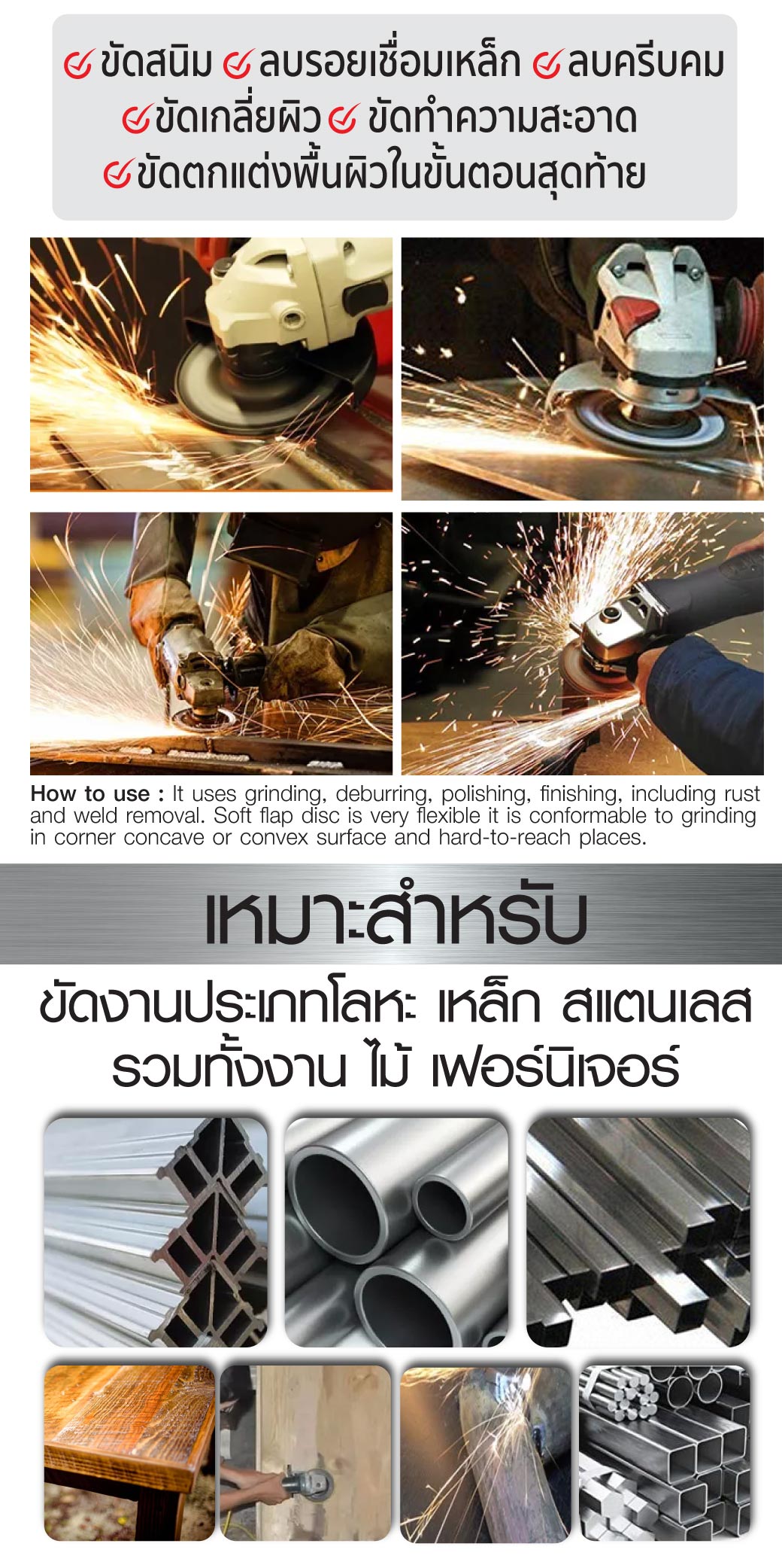 - ขัดงานประเภทโลหะ เหล็ก สแตนเลส รวมทั้งงานไม้เฟอร์นิเจอร์