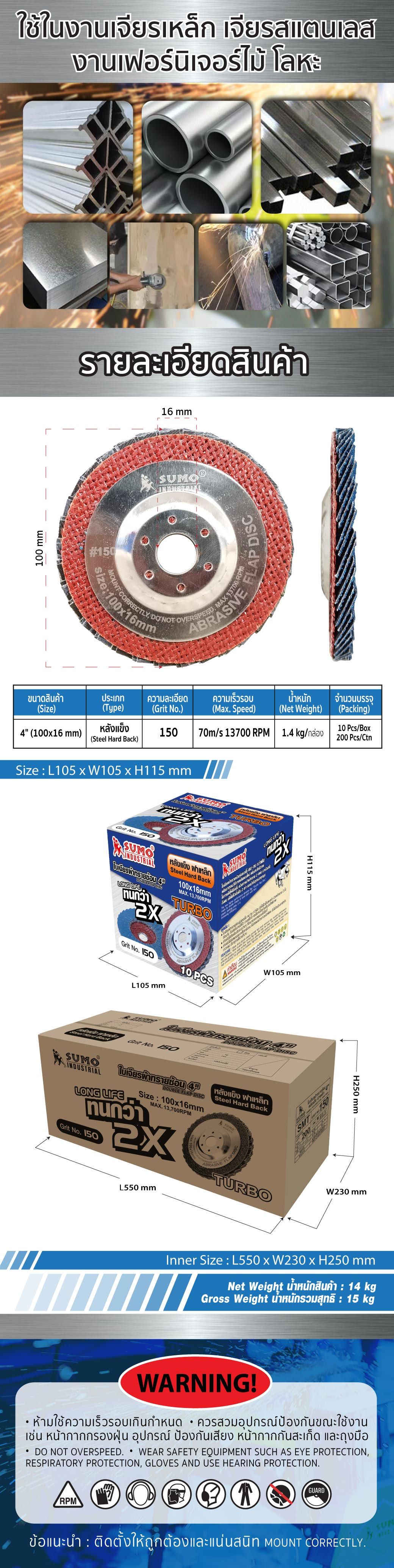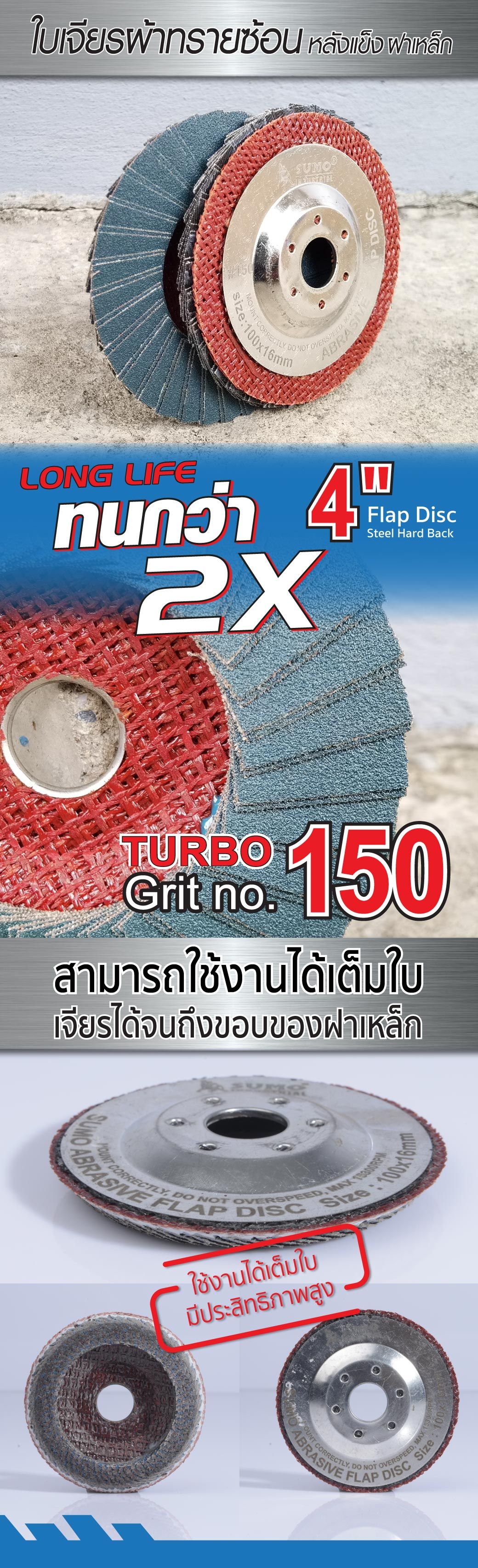 ใบเจียรผ้าทรายซ้อน 4" No.150 หลังแข็ง Turbo ฝาเหล็ก SUMO