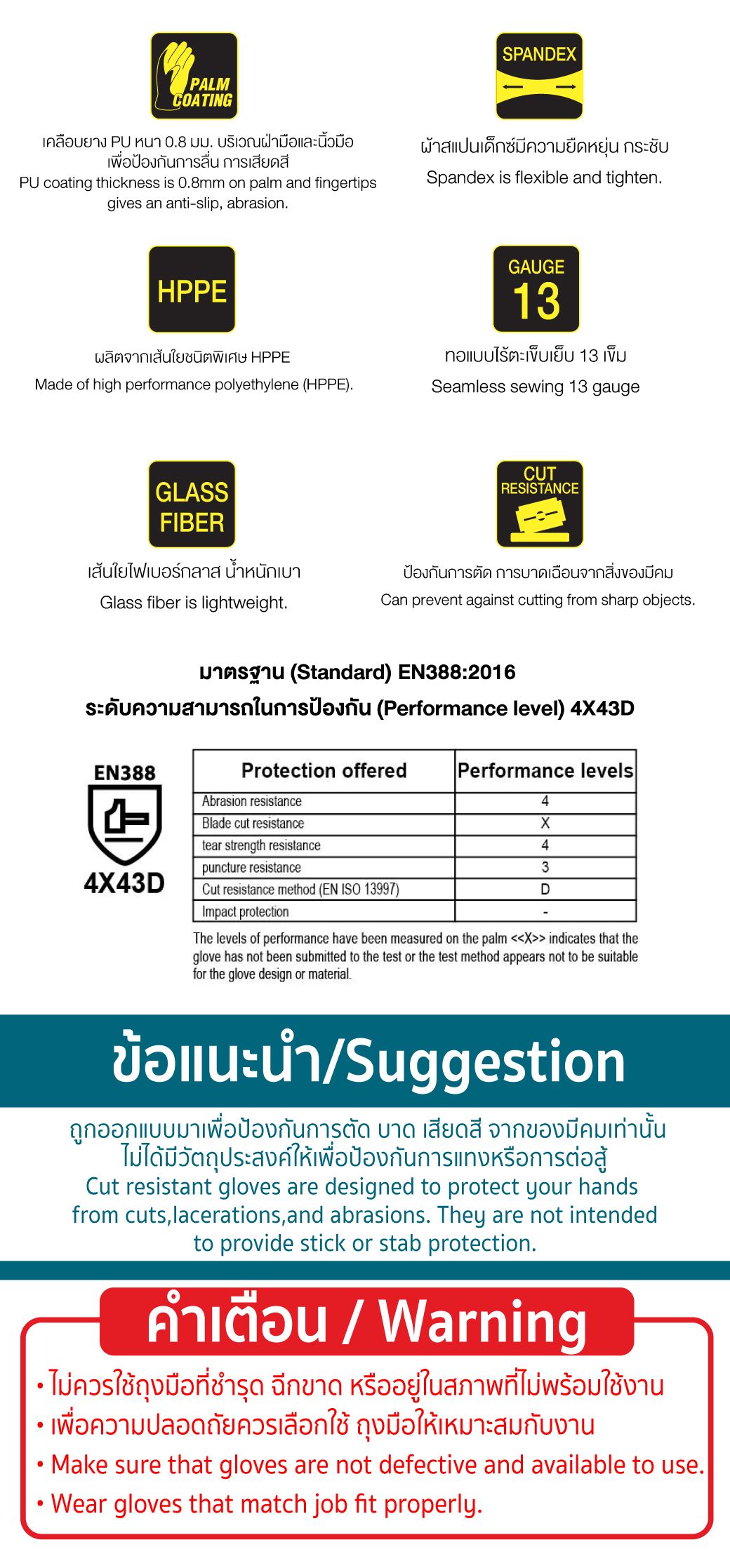 ถุงมือกันบาด เคลือบยาง PU หนา 0.8 มม. บริเวณฝ่ามือและนิ้วมือโดยจะไม่ เคลือบหลังฝ่ามือ เพื่อป้องกันการลื่น การตัด การเสียดสีและ หยิบชิ้นงานได้อย่างสะดวกปลอดภัย