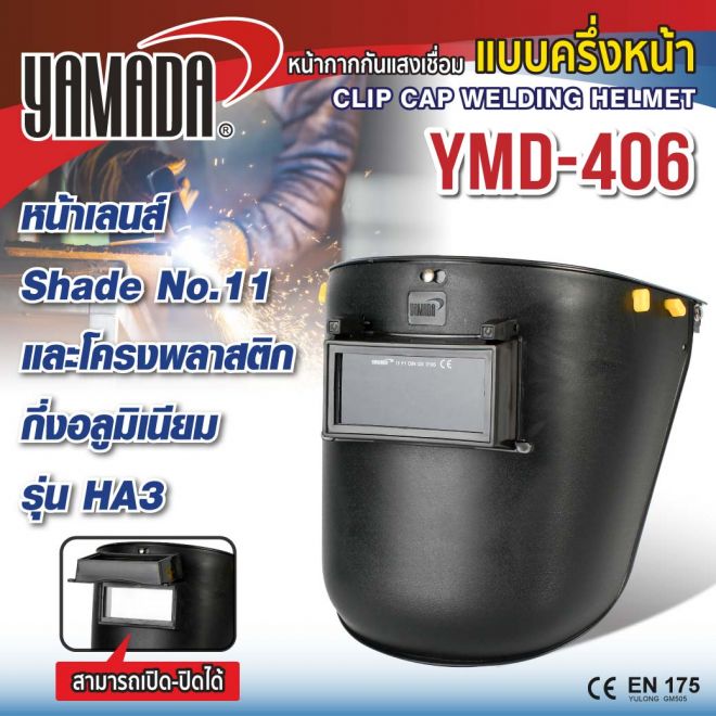 Buyหน้ากากกันแสงเชื่อมแบบครึ่งหน้า รุ่น YMD-406 หน้ากากกันแสงเชื่อม แบบครึ่งหน้า ป้องกันดวงตาจากแสงเชื่อม สะเก็ดหรือฝุ่นละออง หน้ากากกันแสงเชื่อมแบบครึ่งหน้า รุ่น YMD-406 เลนส์ Shade No.11 โครงพลาสติกกึ่งอลูมิเนียม รุ่น HA3 หน้ากากสำหรับงานเชื่อมไฟฟ้า ผลิตจากพลาสติกทนความร้อน ช่วยป้องกันศีรษะของผู้ใช้งานจากวัสดุหรือเศษก่อสร้างอื่นๆ ที่อาจจะตกลงมาจากที่สูงได้ ช่วยป้องกันดวงตาของผู้ใช้จากแสงของงานเชื่อม และสะเก็ดหรือฝุ่นละอองต่างๆ เหมาะสำหรับไซด์งานก่อสร้างและโรงงานอุตสาหกรรม