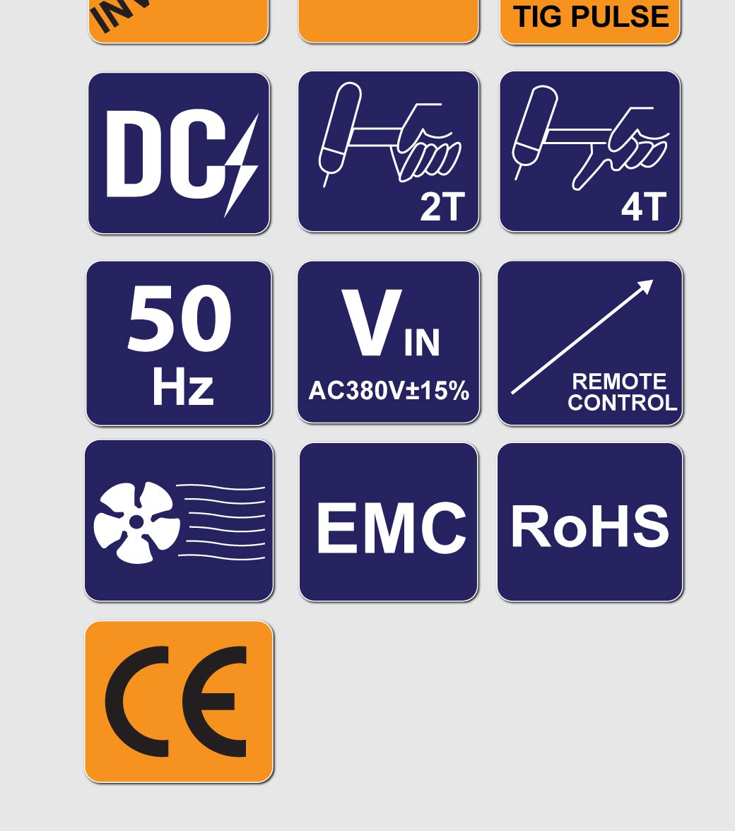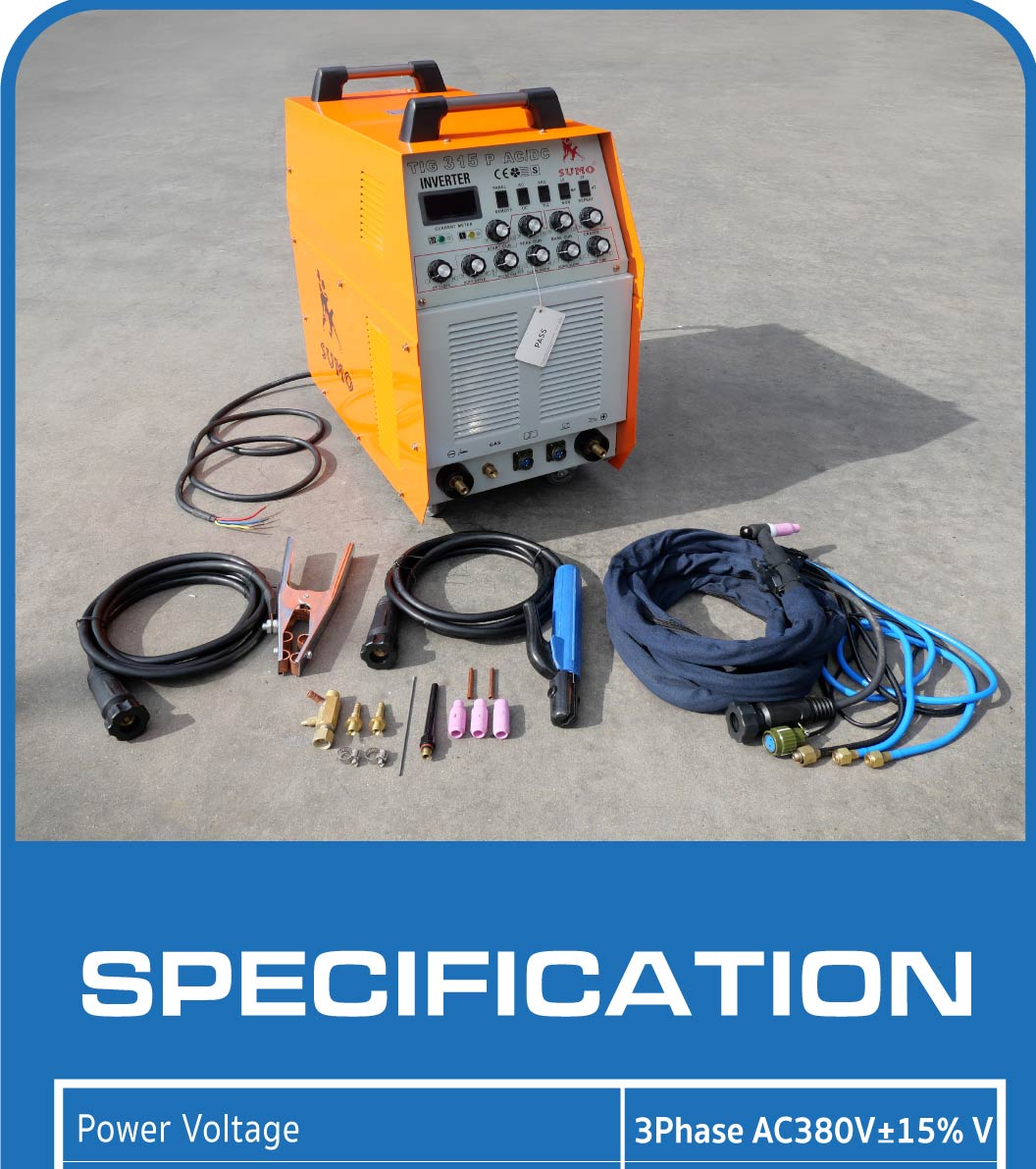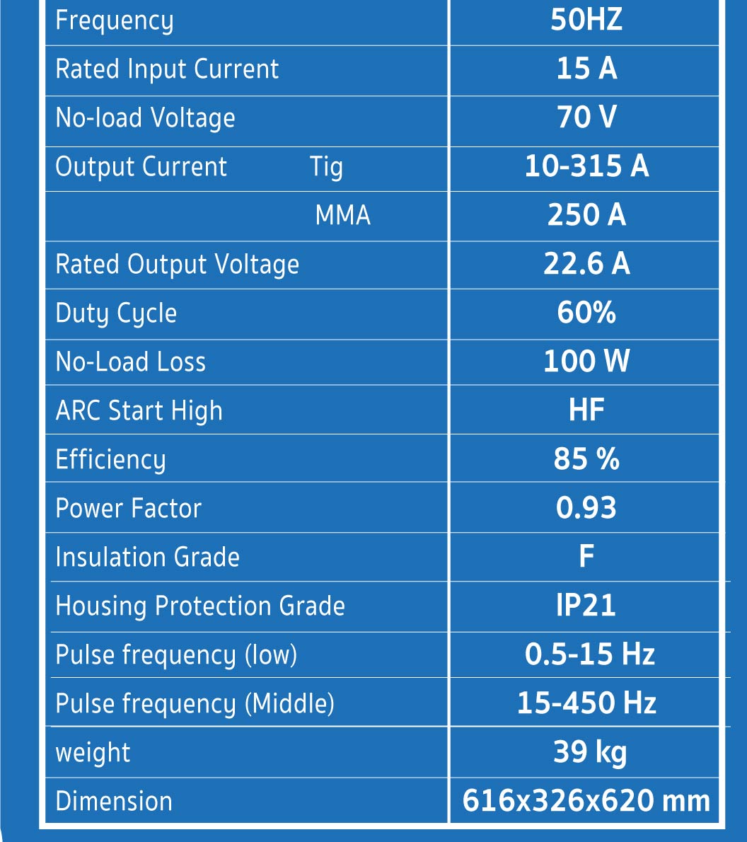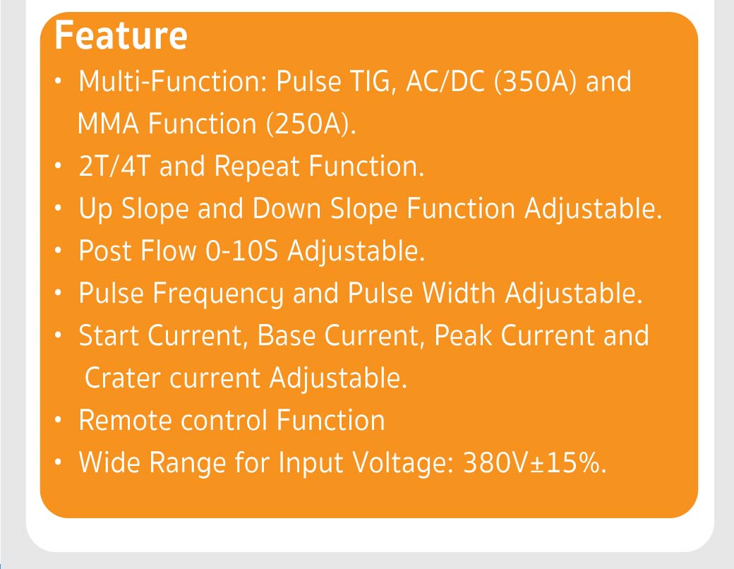 - Multi-Functiono: Pulse TIG, AC/DC (350A) and MMA Function (250A).