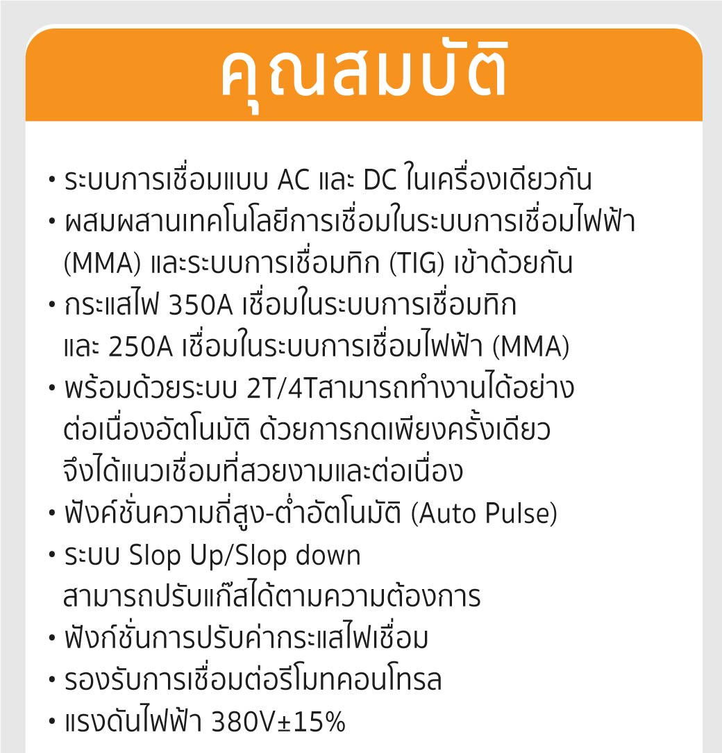 - กระแสไฟ 350A เชื่อมในระบบการเชื่อมทิกและ 250A เชื่อมในระบบการเชื่อมไฟฟ้า (MMA)