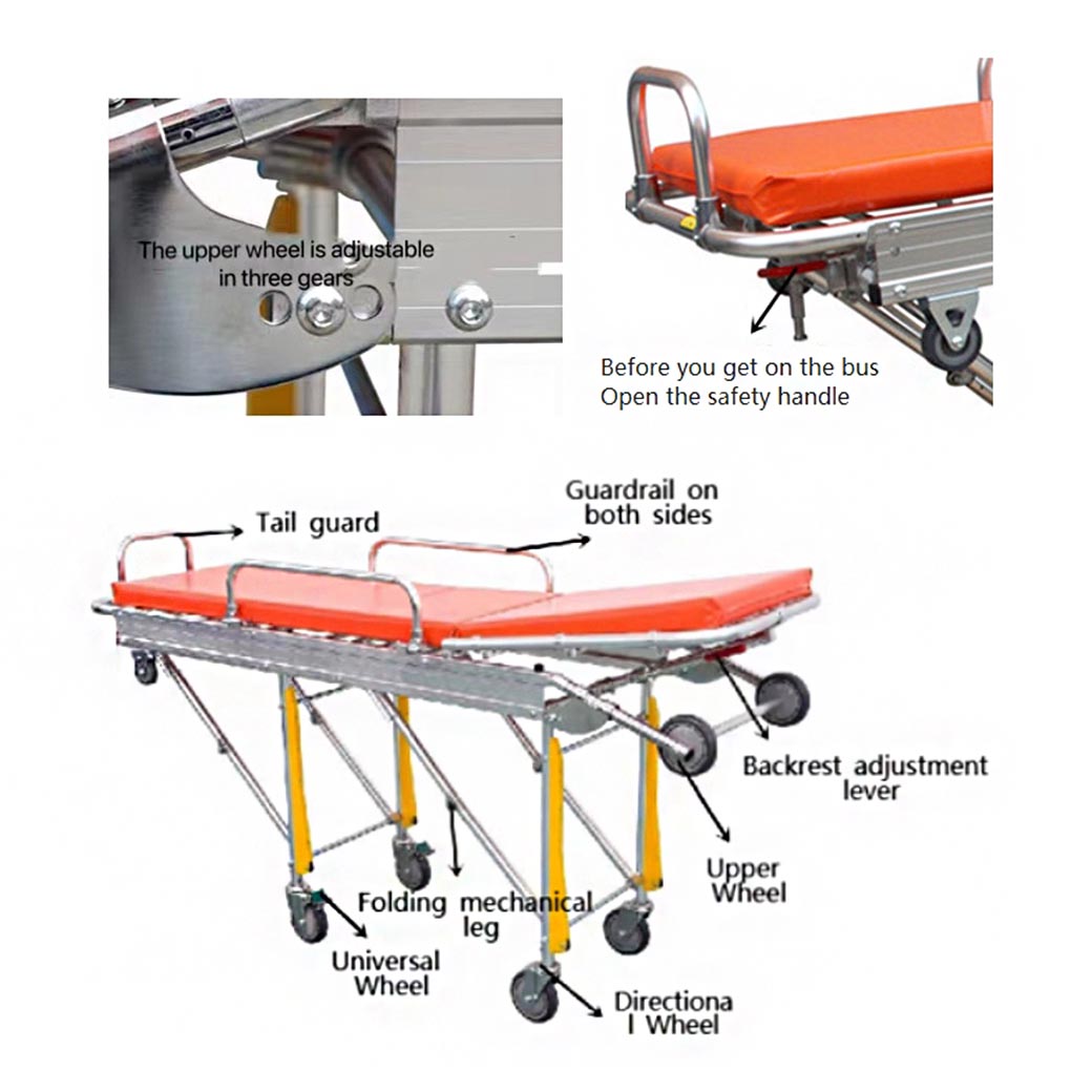 - Ambulance stretcher rotate the safety handle and pinch the handles on both sides to push up the ambulance. When it needs to be lowered, rotate the safety handle and squeeze the handle, the stretcher will be automatically lowered.