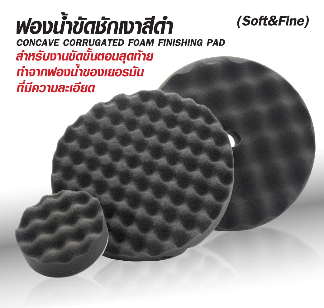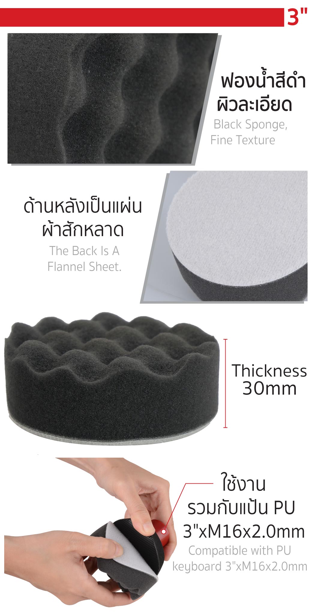 - ฟองน้ำสีดำผิวละเอียด ด้านหลังเป็นแผ่นผ้าสักหลาด ฟองน้ำขนาดเล็กเพื่อขัดในบริเวณที่เข้าถึงได้ยาก ทุกซอกมุม หน้าฟองน้ำเป็นลูกฟูกช่วยระบายความร้อน ทำให้ขัดได้เรียบเนียนและช่วยยืดอายุการใช้งาน เนื้อฟองน้ำมีความยืดหยุ่นสูง ทนทาน ไม่ฉีกขาดง่าย และไม่ทำให้เกิดรอยขนแมว