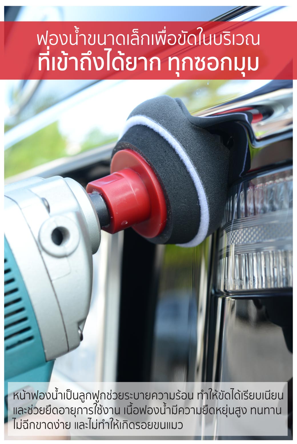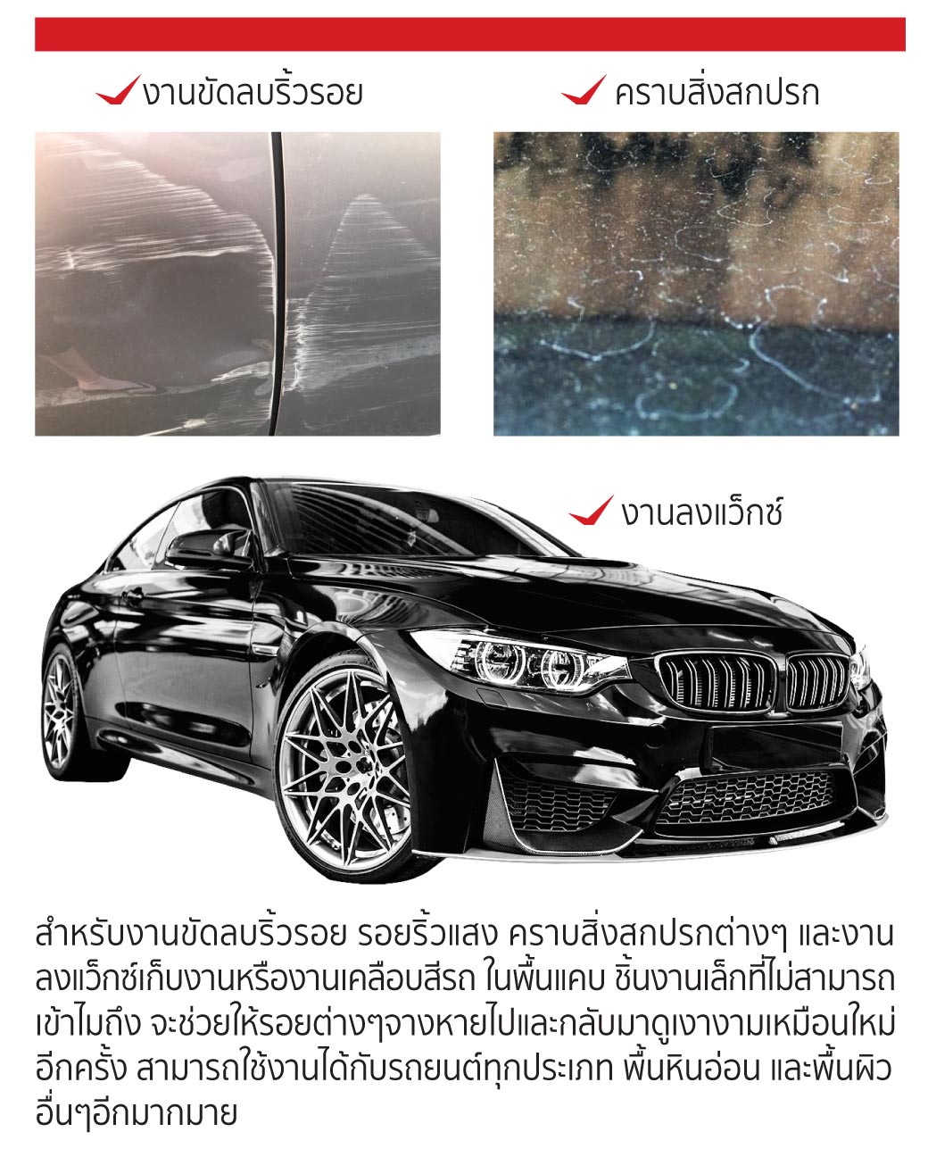 - สำหรับงานขัดลบริ้วรอย รอยริ้วแสง คราบสิ่งสกปรกต่างๆ และงานลงแว็กซ์เก็บงานหรืองานเคลือบสีรถ ในพื้นแคบ ชิ้นงานเล็ก ที่ไม่สามารถเข้าไมถึง จะช่วยให้รอยต่างๆจางหายไป และกลับมาดูเงางามเหมือนใหม่อีกครั้ง สามารถใช้งานได้กับรถยนต์ทุกประเภท พื้นหินอ่อน และพื้นผิวอื่นๆอีกมากมาย