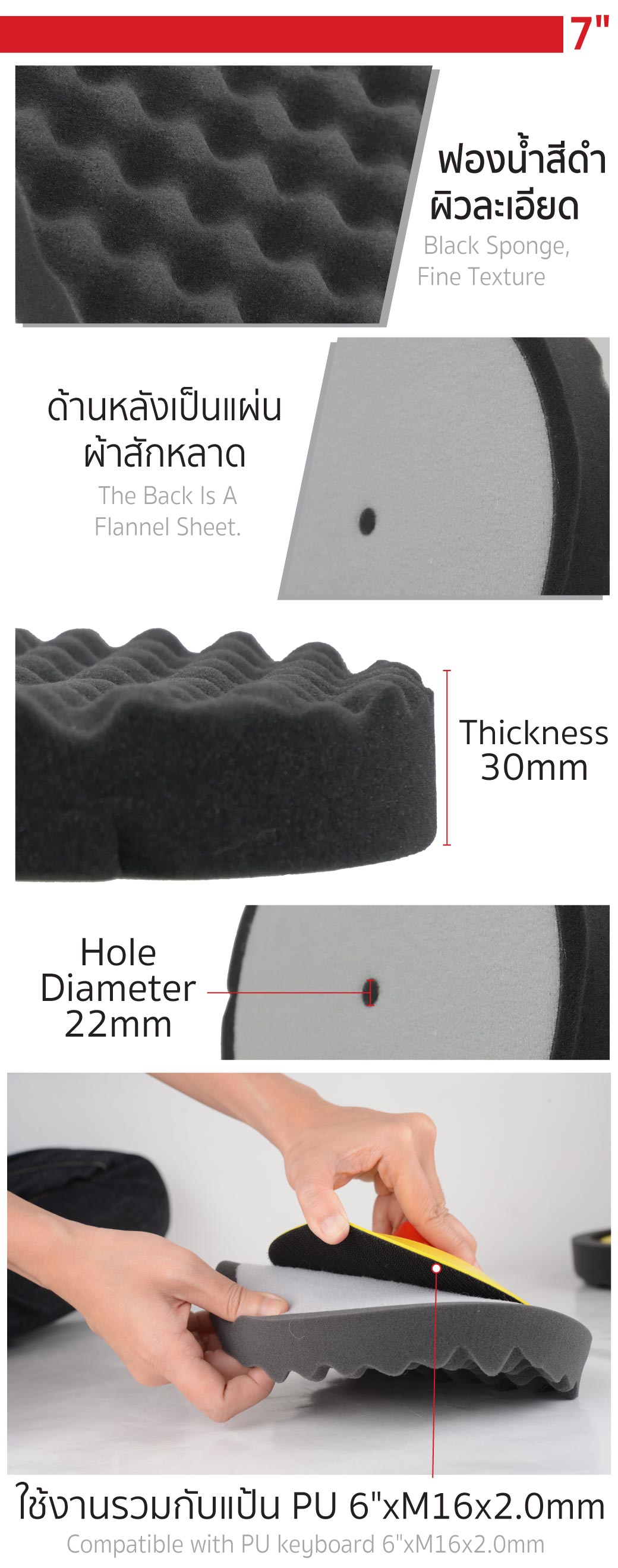 - ทำจากฟองน้ำของเยอรมันที่มีความละเอียด ฟองน้ำสีดำผิวละเอียด ด้านหลังเป็นแผ่นผ้าสักหลาด สามารถลบรอยขัดแกะให้ความเงางาม เหมือนกระจก ใช้สำหรับงานเก็บริ้วรอย รอยริ้วแสง ขจัดคราบสิ่งสกปรกต่างๆ งานลงแว็กซ์เก็บงานหรืองานเคลือบสีรถ พื้นหินอ่อน และพื้นผิวอื่นๆ ฟองน้ำเป็นทรงลูกฟูกช่วยระบายความร้อน ทำให้ขัดได้เรียบเนียนและช่วยยืดอายุการใช้งานเนื้อฟองน้ำมีความยืดหยุ่นสูง ทนทาน ไม่ฉีกขาดง่าย และไม่ทำให้เกิดรอยขนแมว