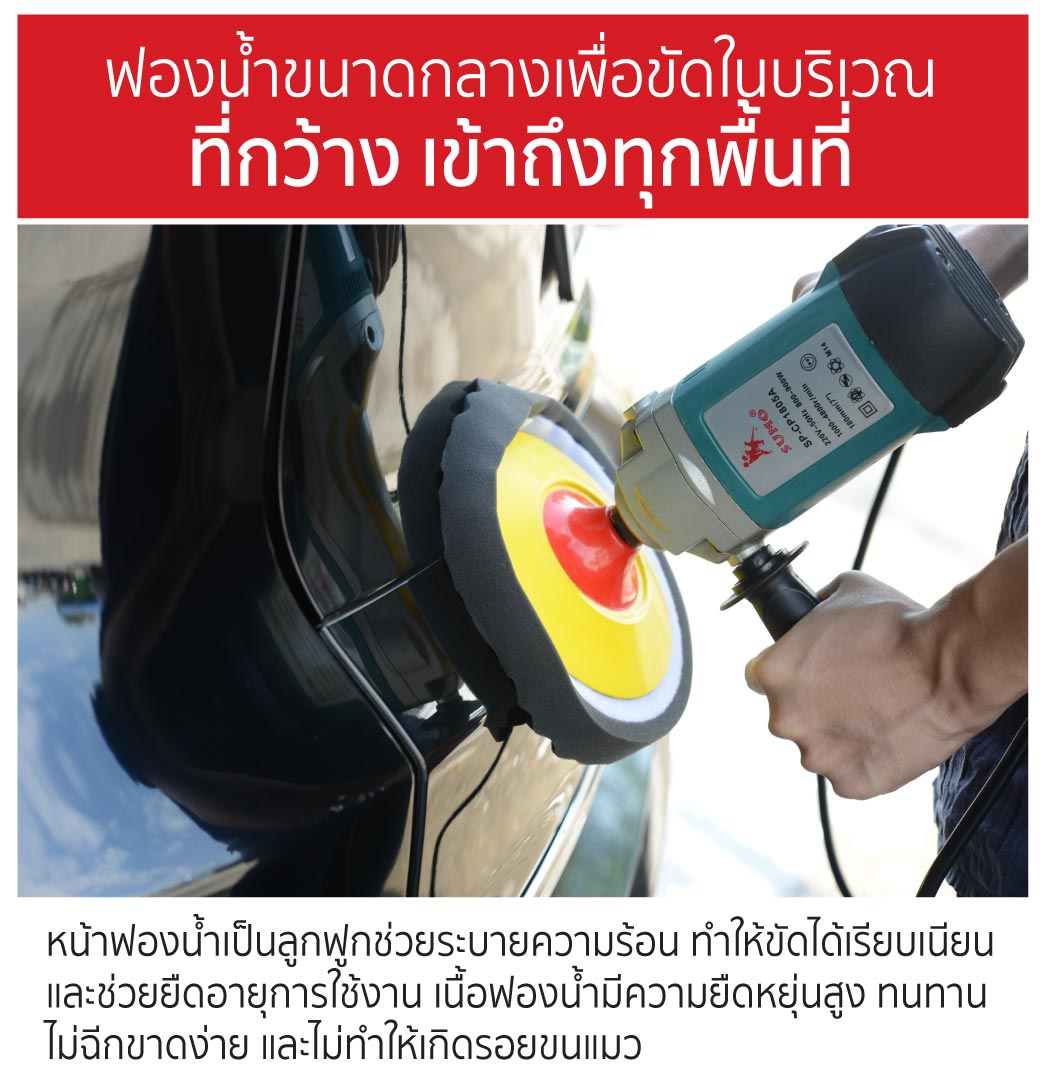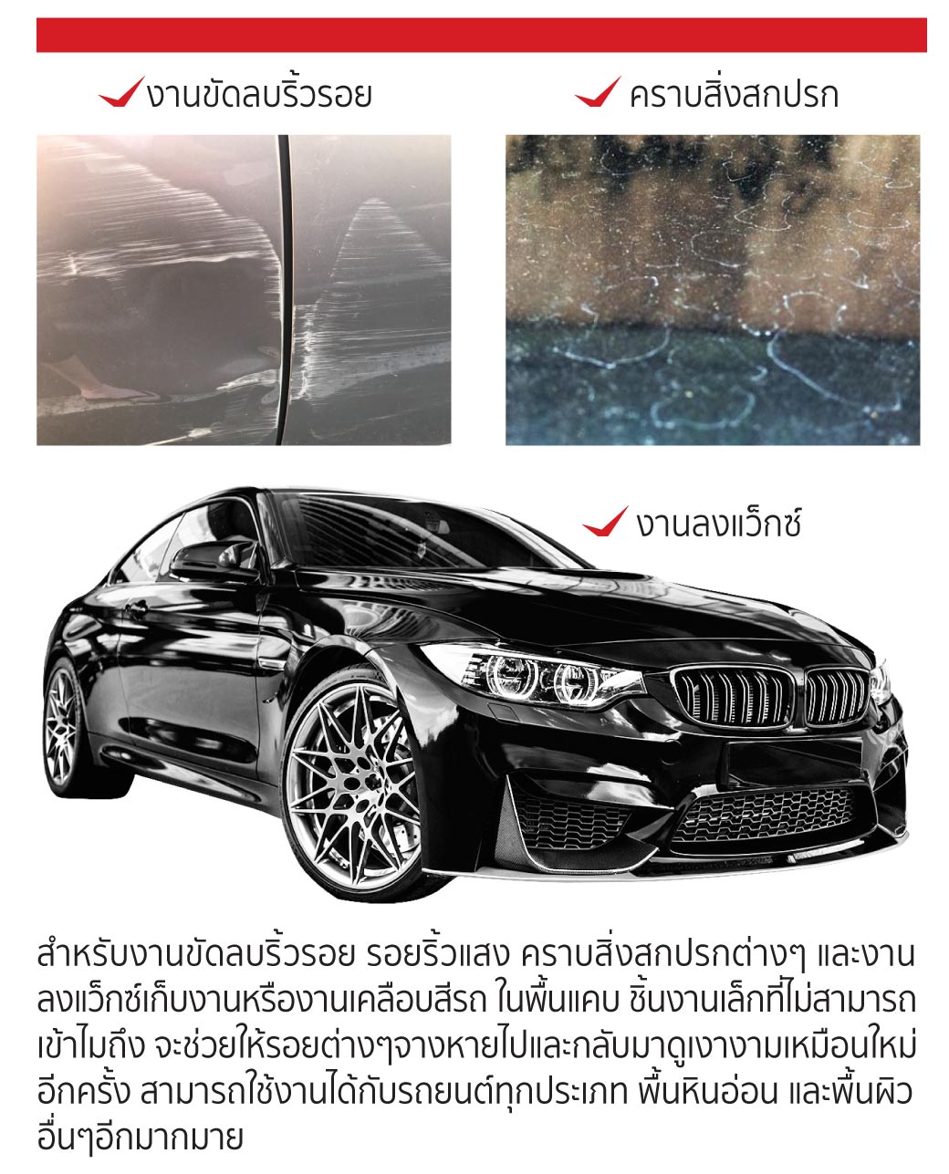 - ใช้สำหรับงานเก็บริ้วรอยขนแกะ รอยริ้วแสง ขจัดคราบสิ่งสกปรกต่างๆ และงานลงแว็กซ์เก็บงานหรืองานเคลือบสีรถ จะช่วยให้รอยต่างๆจางหายไป และกลับมาดูเงางามเหมือนใหม่อีกครั้ง สามารถใช้งานได้กับรถยนต์ทุกประเภทพื้นหินอ่อน และพื้นผิวอื่นๆอีกมากมาย