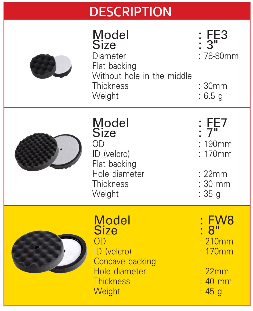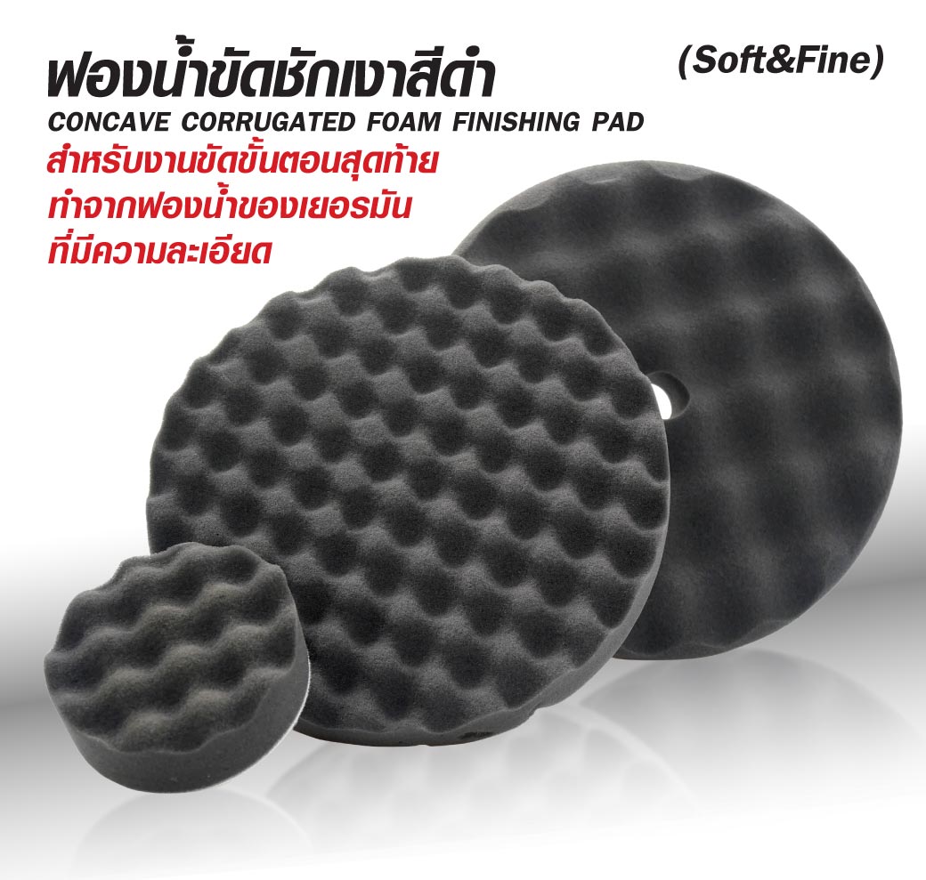 - ฟองน้ำขัดชักเงา 8 นิ้ว ผิวละเอียด ด้านหลังเป็นแผ่นผ้าสักหลาด ฟองน้ำขนาดเล็กเพื่อขัดในบริเวณที่เข้าถึงได้ยาก ทุกซอกมุม หน้าฟองน้ำเป็นลูกฟูกช่วยระบายความร้อน ทำให้ขัดได้เรียบเนียนและช่วยยืดอายุการใช้งาน เนื้อฟองน้ำมีความยืดหยุ่นสูง ทนทาน ไม่ฉีกขาดง่าย และไม่ทำให้เกิดรอยขนแมว