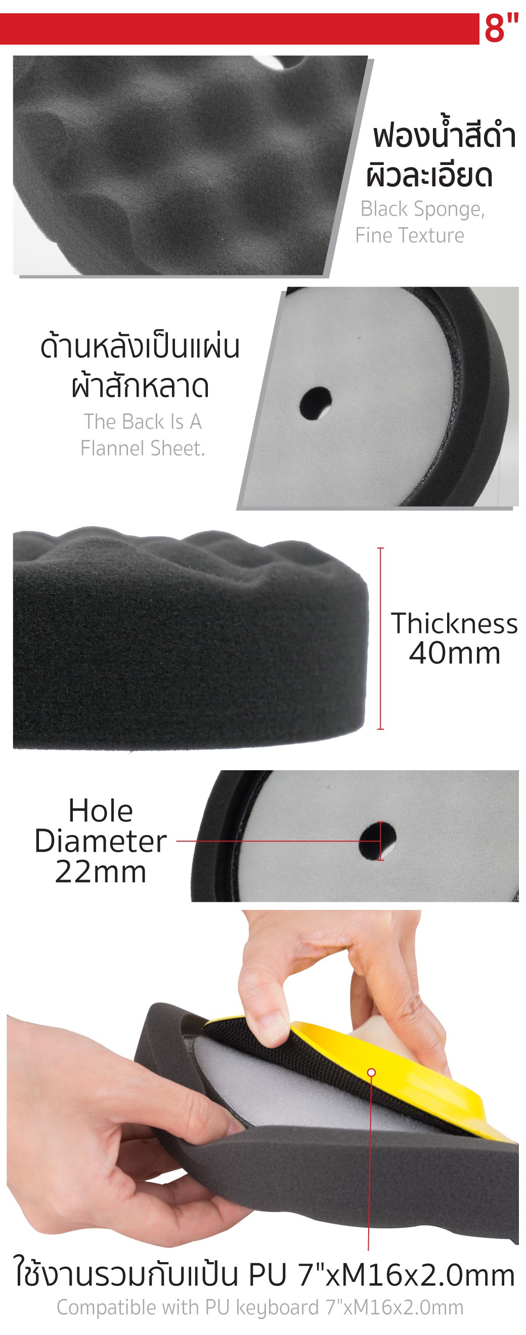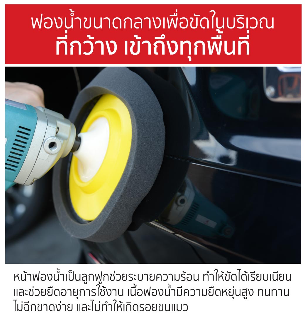- ฟองน้ำขัดชักเงา 8 นิ้วใช้สำหรับงานเก็บริ้วรอยแกะ รอยริ้วแสง ขจัดคราบสิ่งสกปรกต่างๆ และงานลงแว็กซ์เก็บงานหรืองานเคลือบสีรถ จะช่วยให้รอยต่างๆจางหายไป และกลับมาดูเงางามเหมือนใหม่อีกครั้ง สามารถใช้งานได้กับรถยนต์ทุกประเภท พื้นหินอ่อน และพื้นผิวอื่นๆอีกมากมาย