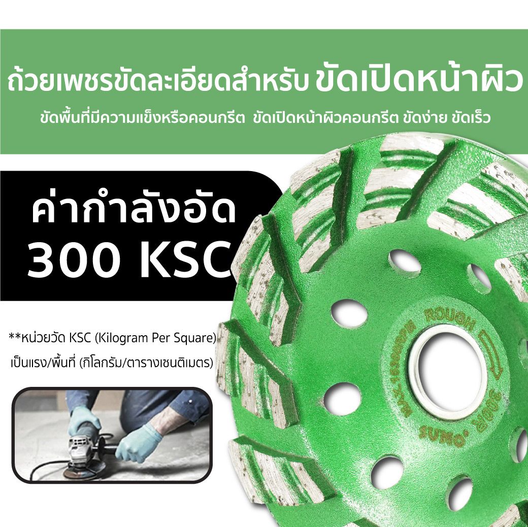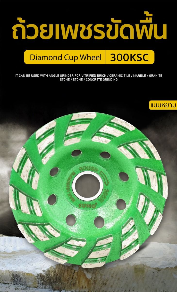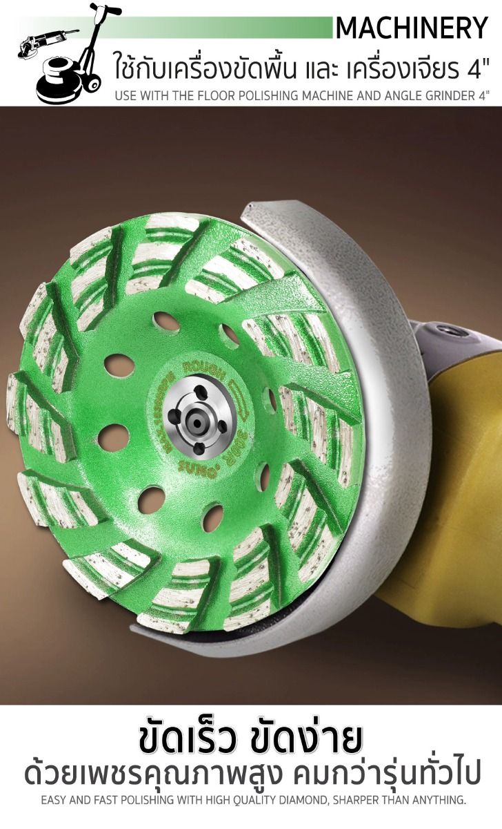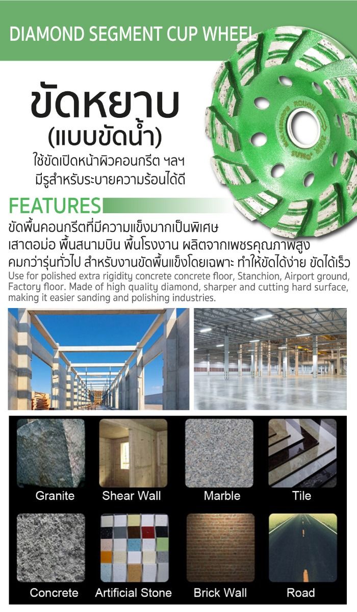 - ผลิตจากเพชรคุณภาพสูง คมกว่าทั่วไป สำหรับงานขัดพื้นแข็งโดยเฉพาะทำให้ขัดได้ง่าย ขัดได้เร็ว