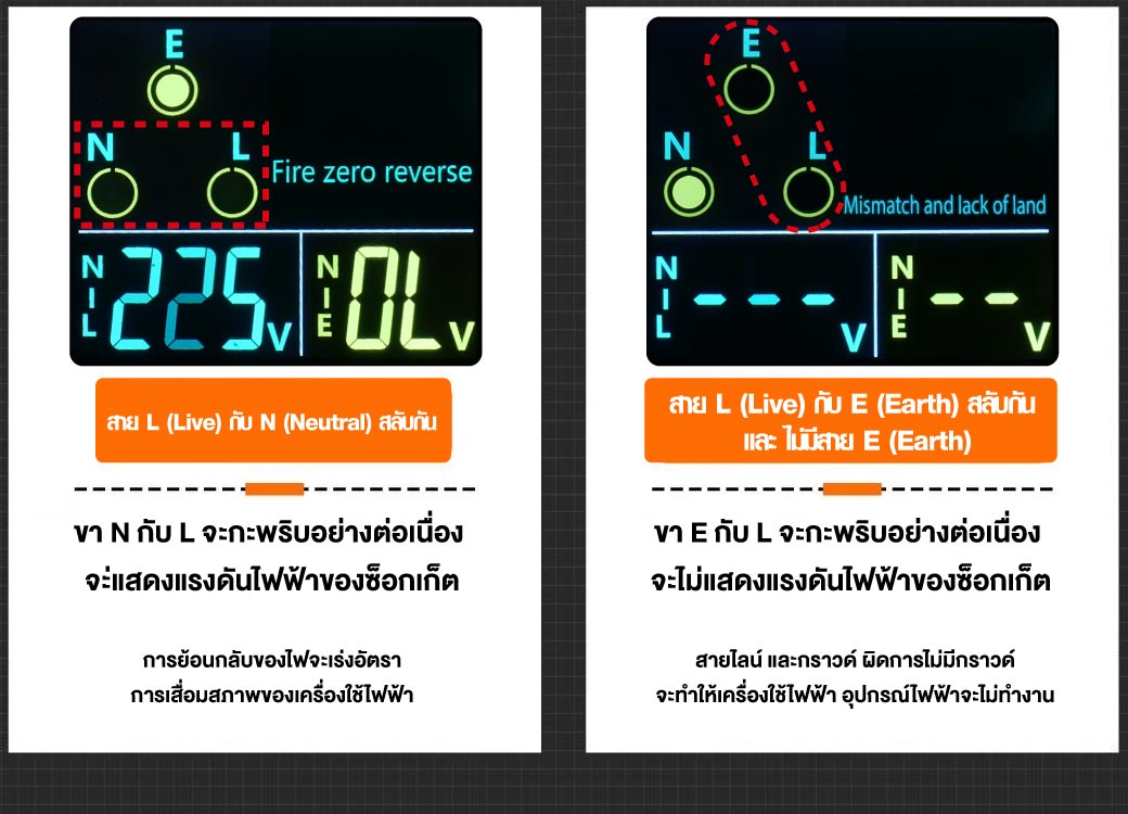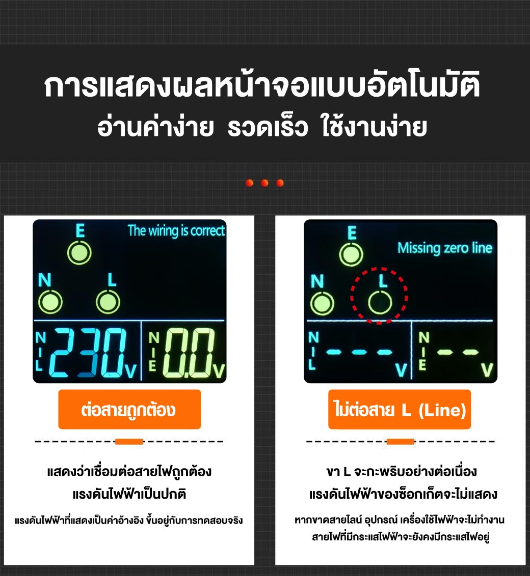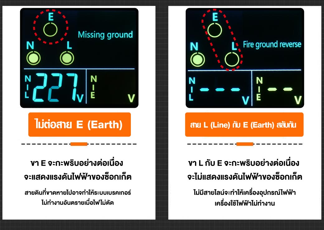 - โดยเพียงแค่เราเสียบเข้ากับเต้ารับทำให้เรารู้ว่า มีกราวด์หรือไม่ หรือเดินสายไฟสลับผิดเส้นหรือเปล่า รวมทั้งยังสามารถเช็คแรงดันไฟฟ้าจะได้รู้ว่า ไฟบ้านมีปัญหาไฟตก-ไฟเกิน หรือไม่ และยังสามารถเช็คได้ว่าเบรกเกอร์ RCDของเราทำงานหรือไม่ โดยวัดที่ >30mA