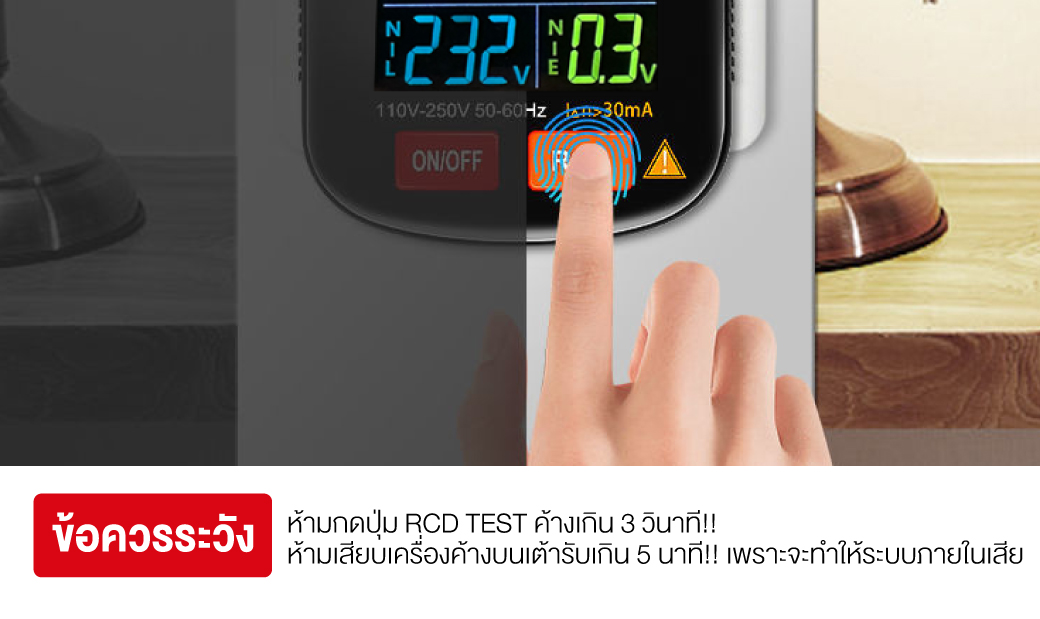 - ห้ามกดปุ่ม RCD TEST ค้างไว้ 3 วินาที เพราะจะทำให้ระบบภายในเสีย