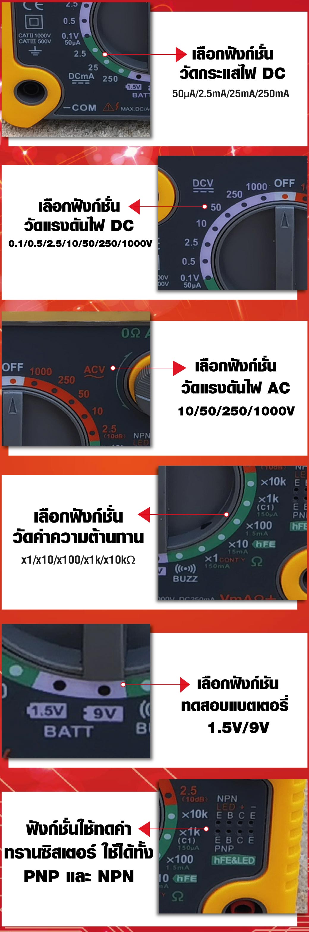 - วัดแรงดันไฟฟ้าได้ 1000V ทั้ง AC/DC