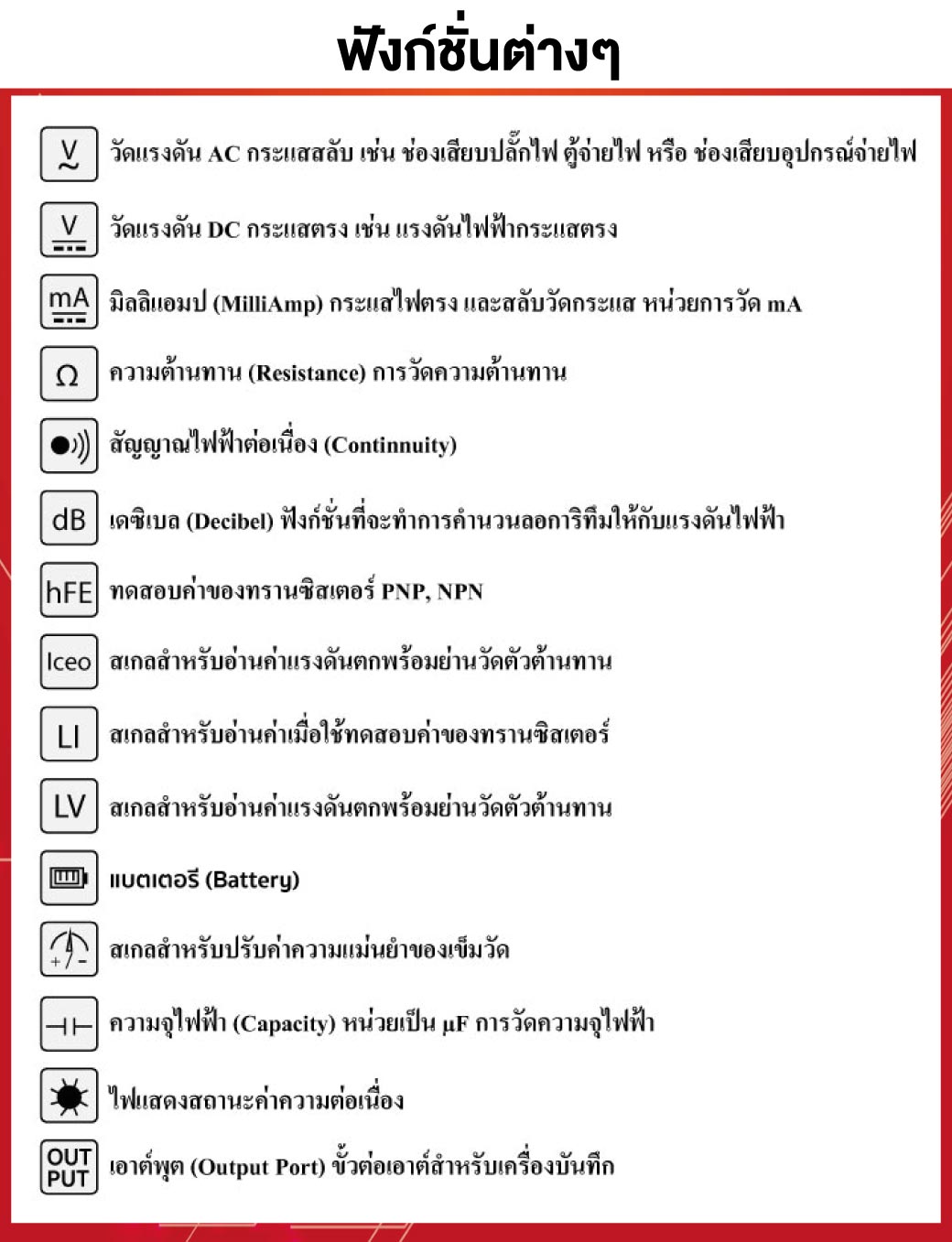 - ฟังก์ชันทดสอบตัวเก็บประจุได้สูงถึง 2000µµF