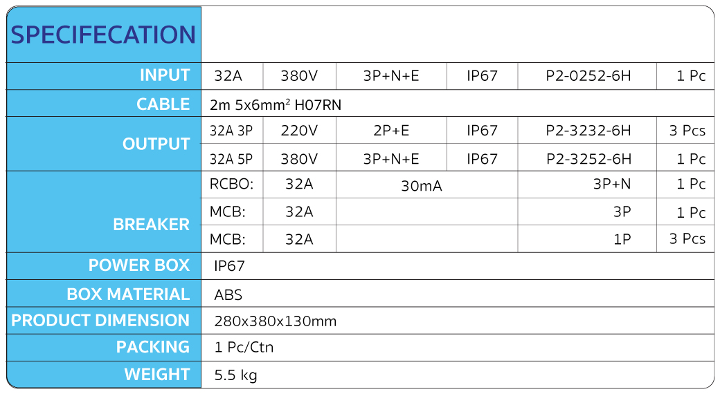 | OUTPUT | 32A 3P | 220V | 2P+E | IP67 | P2-3232-6H | 3 pcs | ||