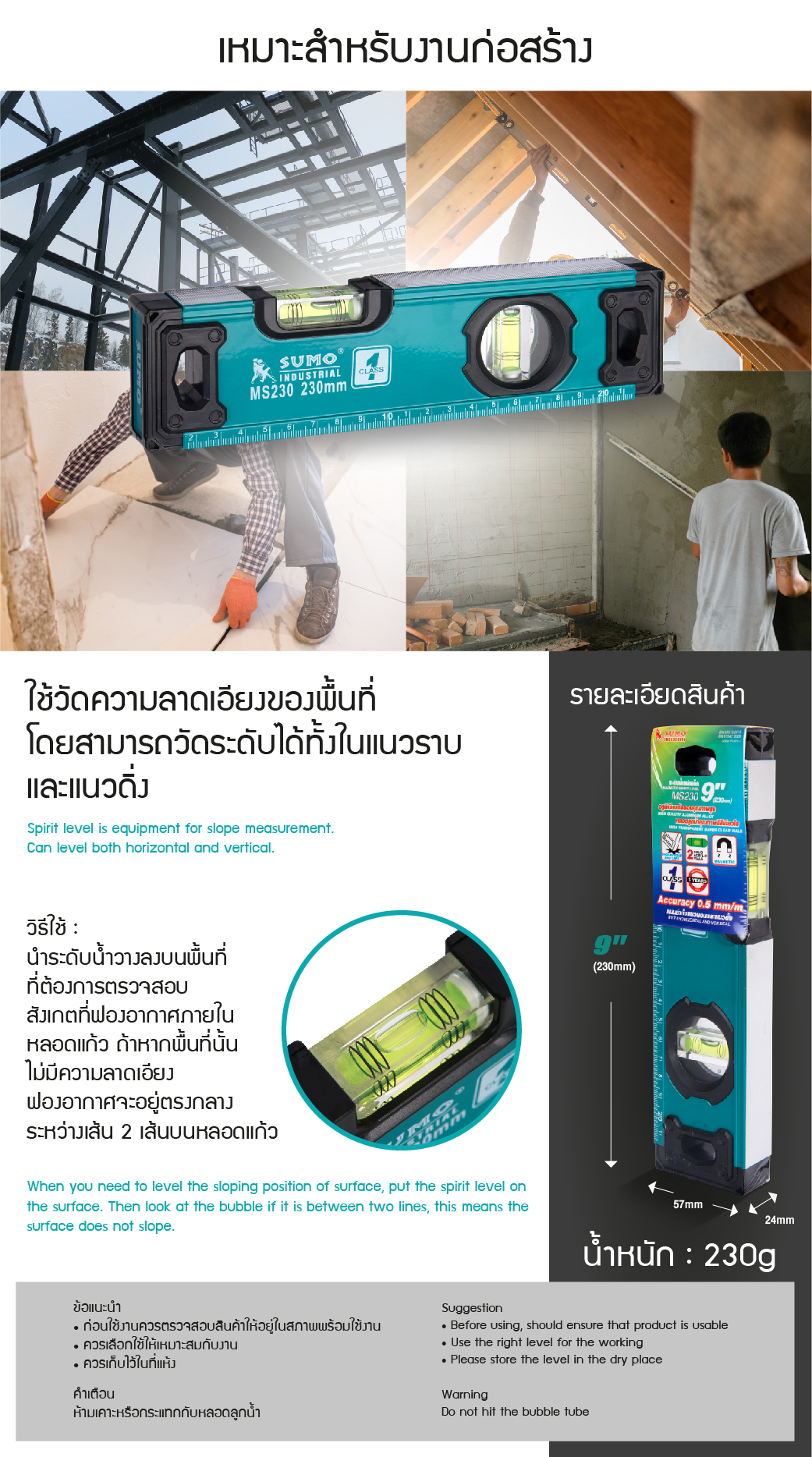 หลอดลูกน้ำคุณภาพดีสีเขียวใส ไม่ขุ่นหมอง ทำให้สามารถวัดระดับได้อย่างถูกต้อง แม่นยำ