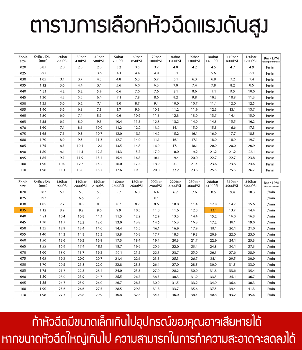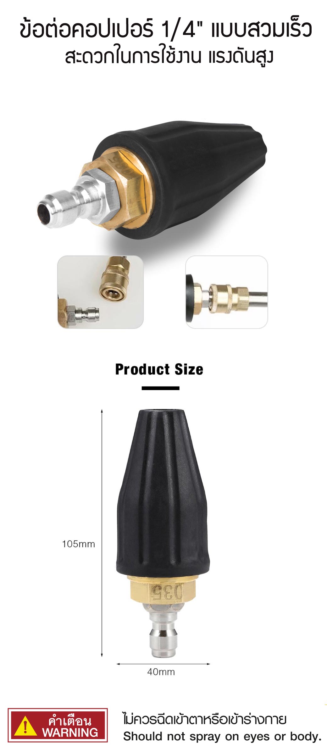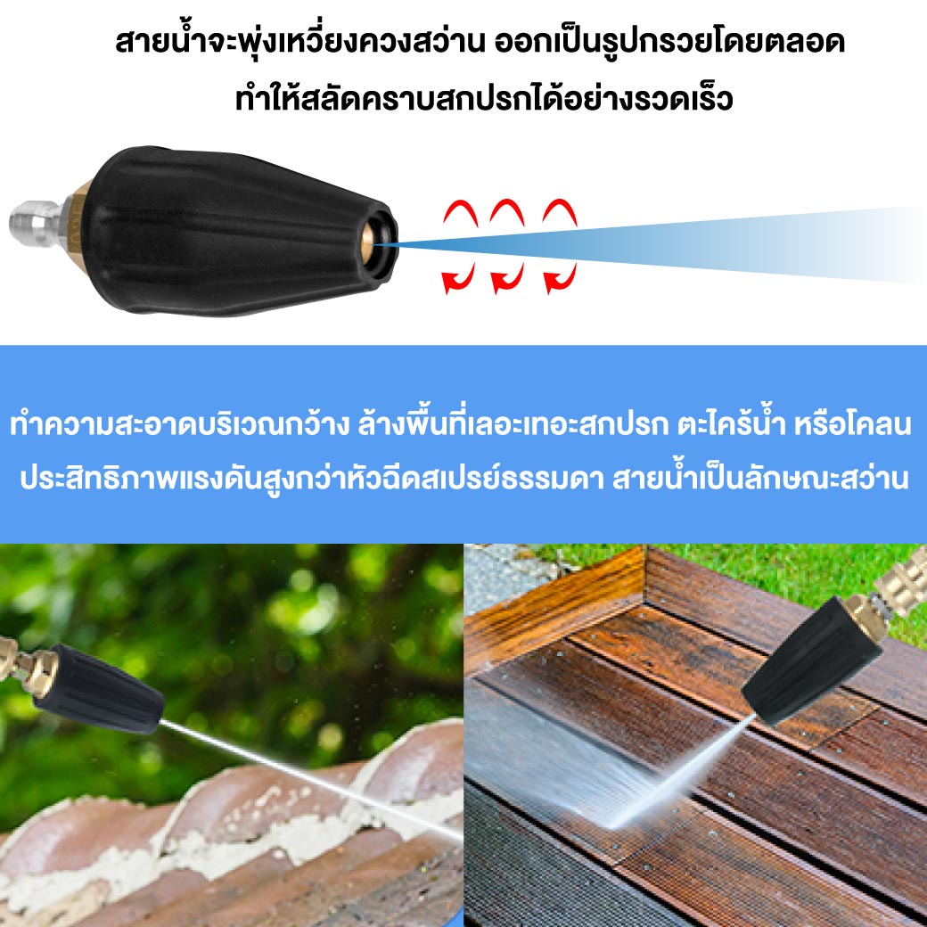 - หัวฉีดโรตารี่ เหมาะอย่างยิ่งสำหรับการทำความสะอาดบริเวณกว้าง ล้างพื้นที่เลอะเทอะสกปรก ตะไคร้น้ำ หรือโคลน ประสิทธิภาพแรงดันสูงกว่าหัวฉีดสเปรย์ธรรมดา สายน้ำเป็นลักษณะสว่าน
