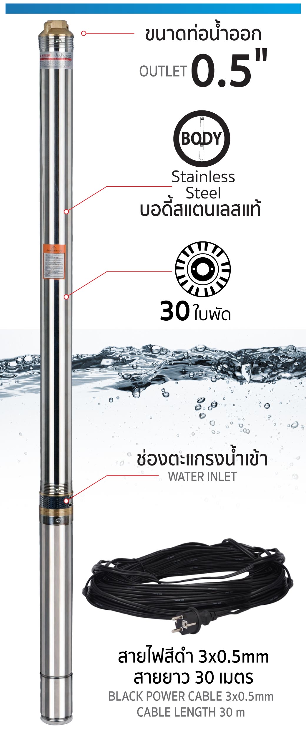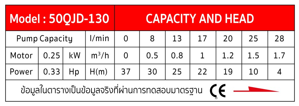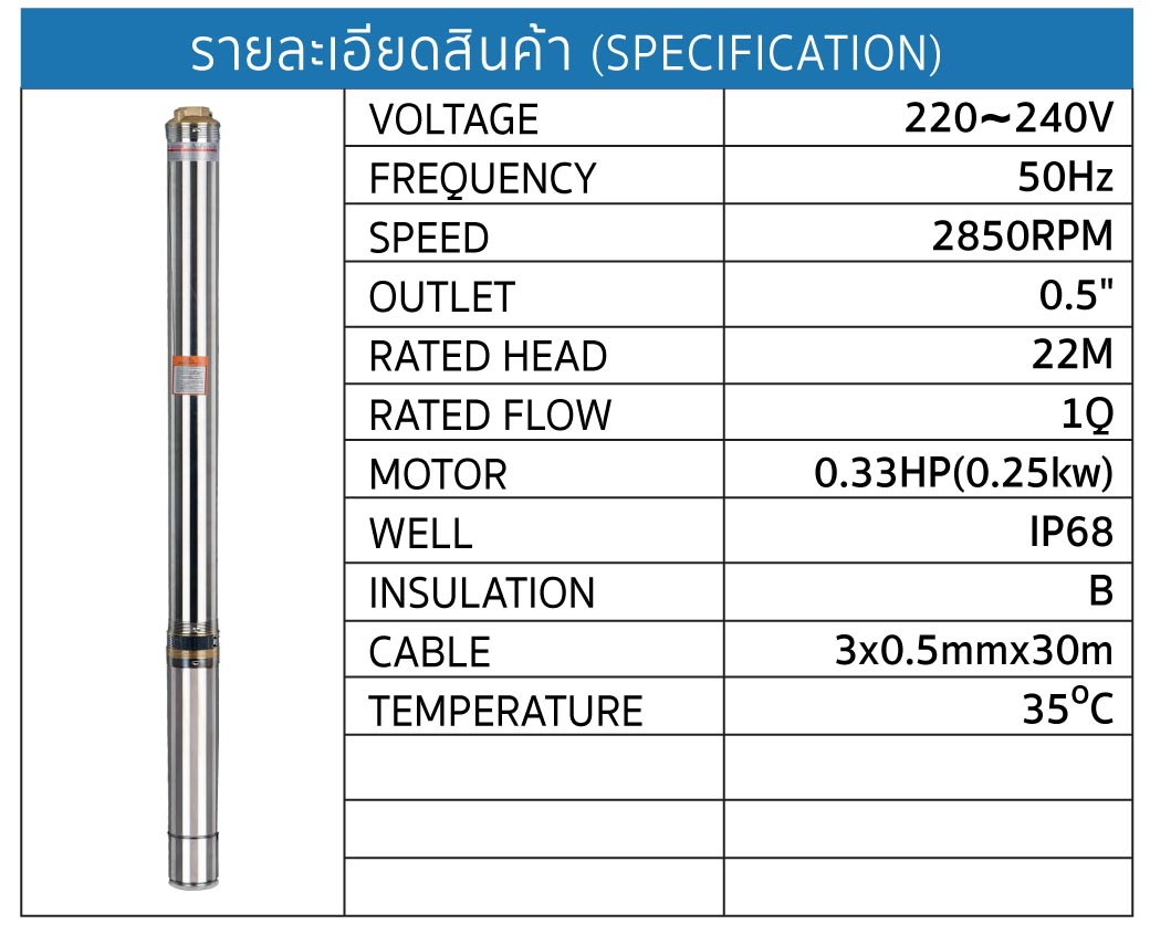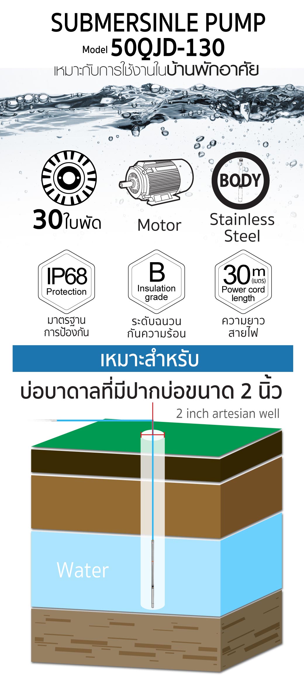 รายละเอียด ปั๊มน้ำบาดาล รุ่น 50QJD-130 0.33HP SUMO