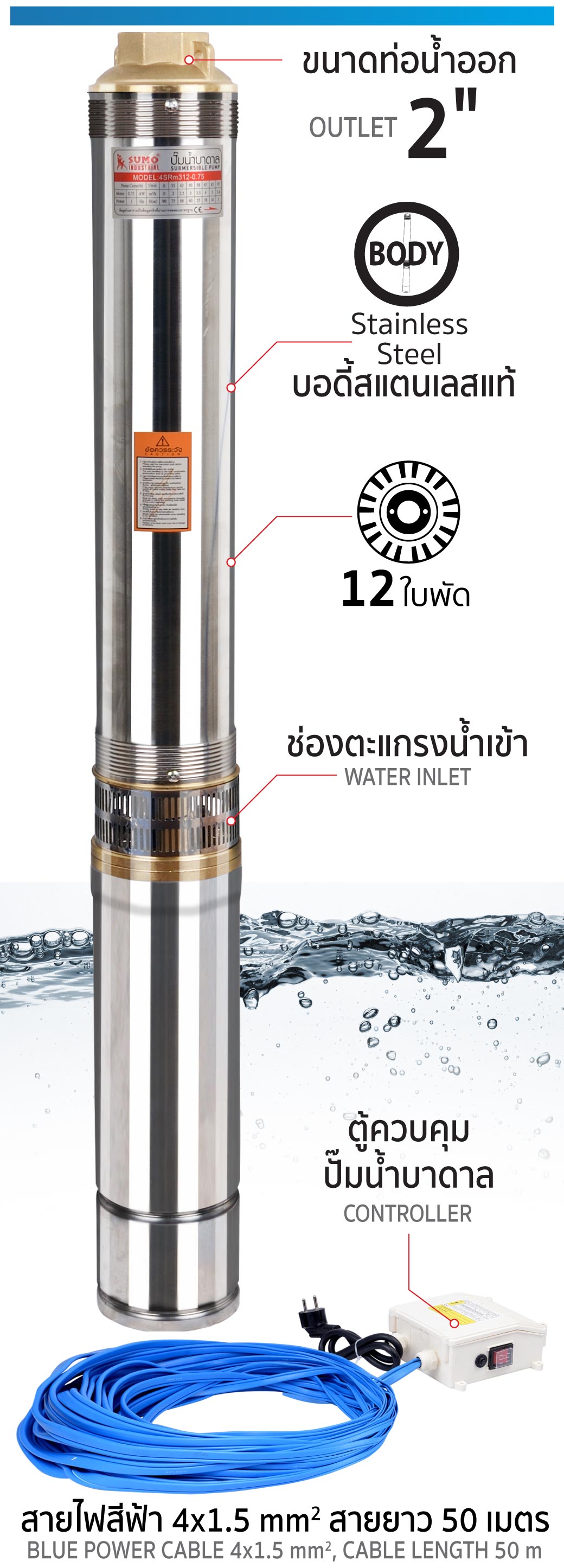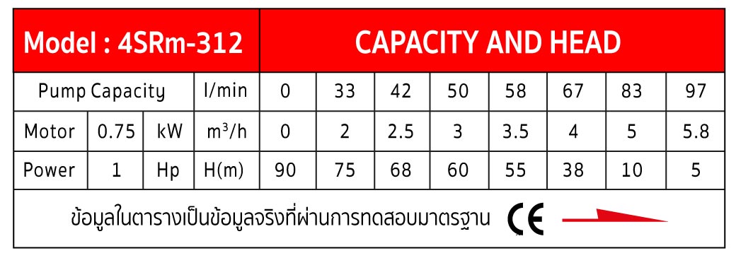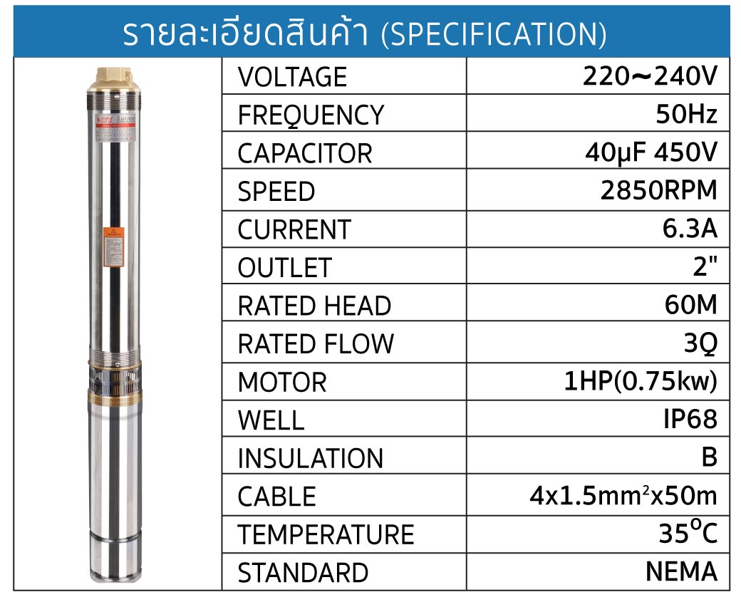 รายละเอียด ปั๊มน้ำบาดาล รุ่น 4SRm312 1.0HP SUMO