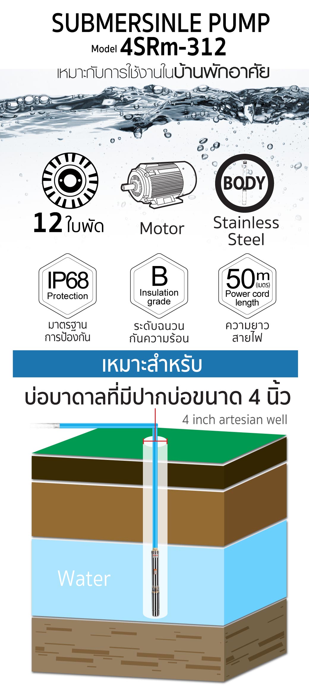 ปั๊มน้ำบาดาล ขนาด 4 นิ้ว รุ่น 4SRm-312 SUMO
