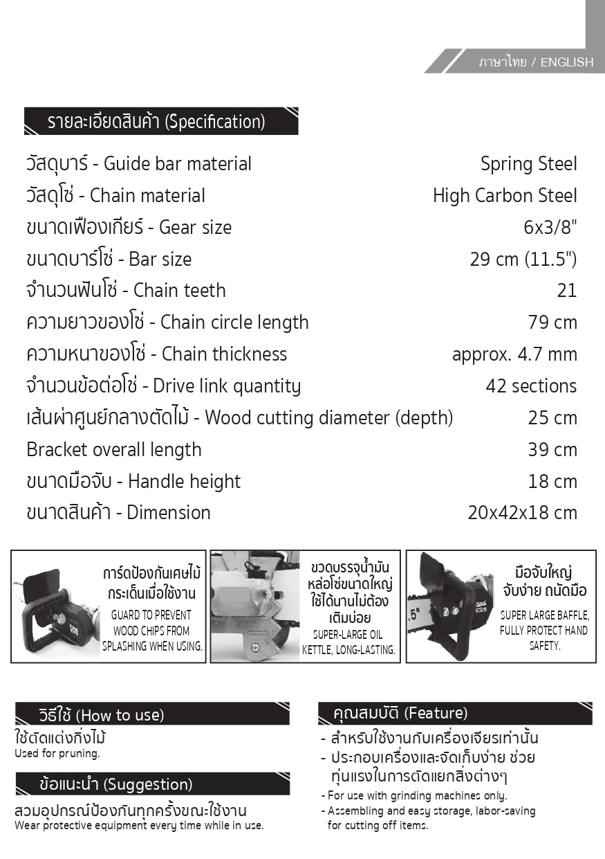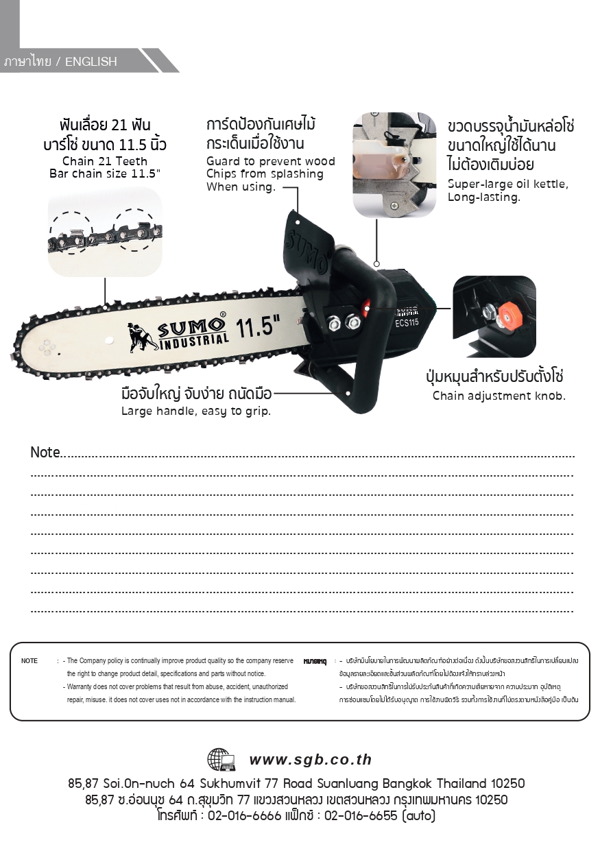 - ห้ามดัดแปลงโซ่และบาร์ที่ขนาดเกิน 11.5นิ้ว (ตามที่กฎหมายกำหนดใว้) หากฝ่าฝืนทางบริษัทจะไม่รับผิดชอบใดๆทั้งสิ้น