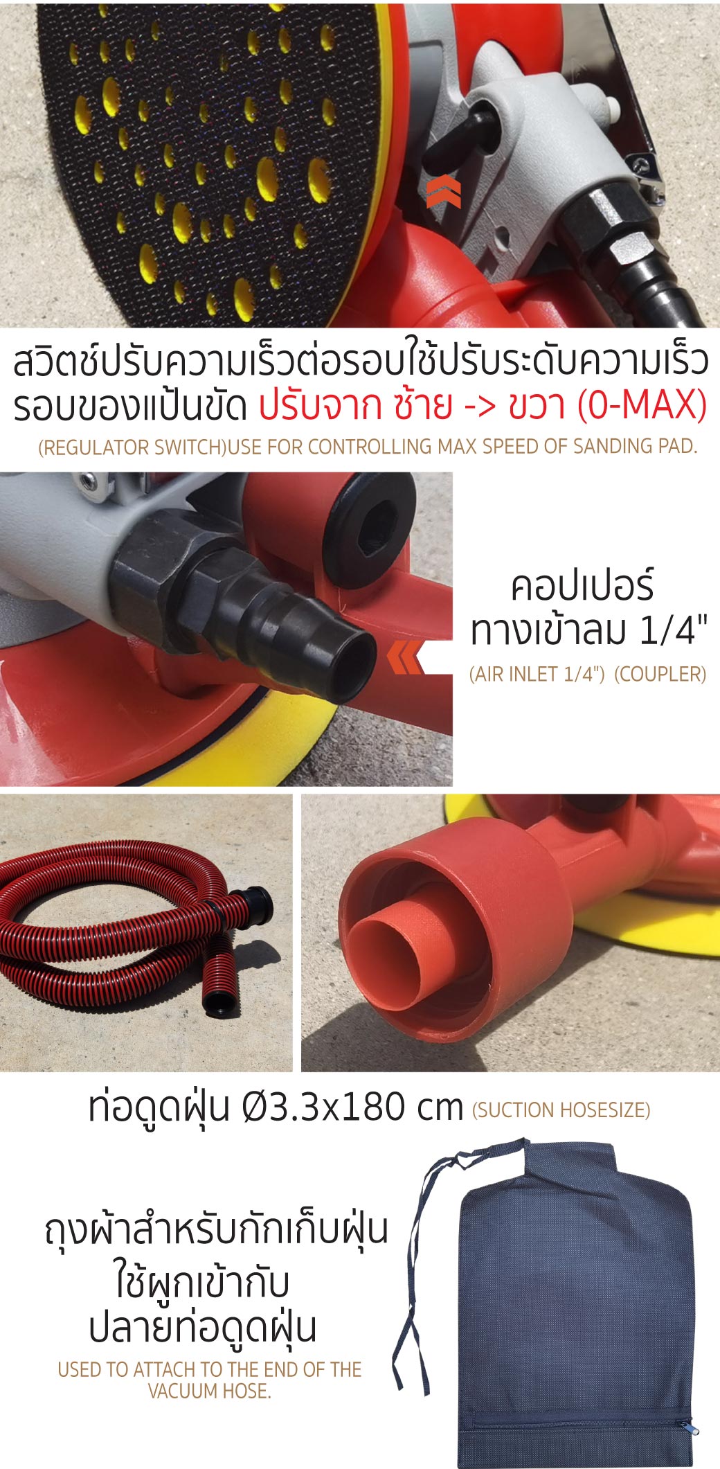 - เป็น เครื่องขัดกระดาษทรายลม แบบดูดฝุ่นได้ โดยสามารถใช้กับกระดาษทรายตีนตุ๊กแกแบบมีรูได้ และมาพร้อมกับถุงเก็บฝุ่นในตัว