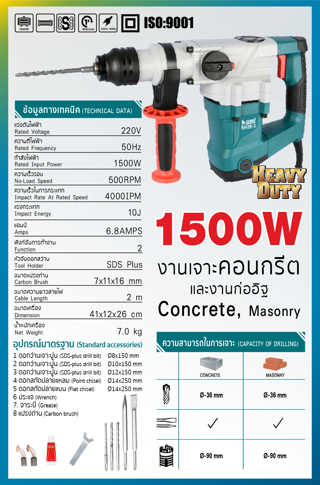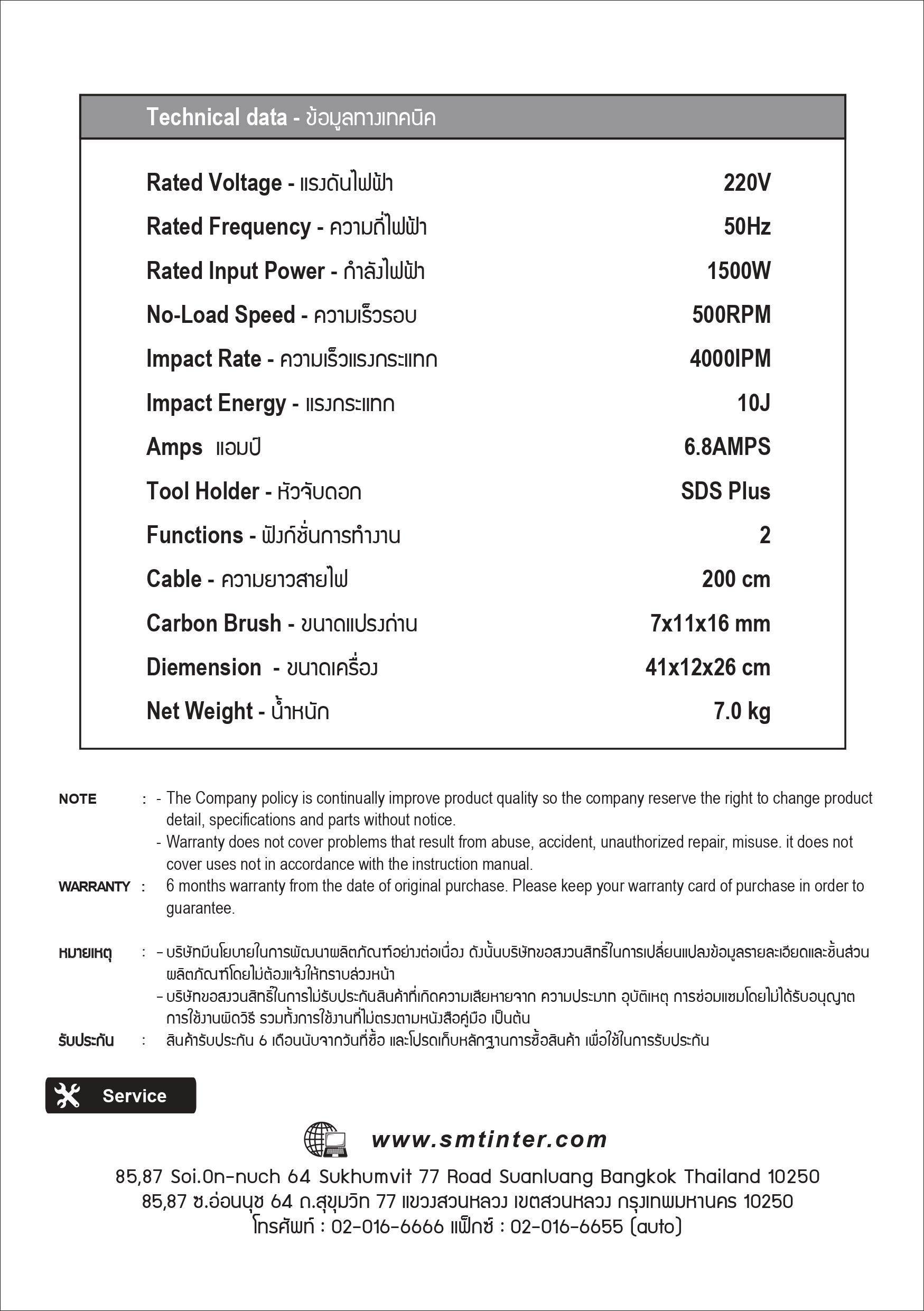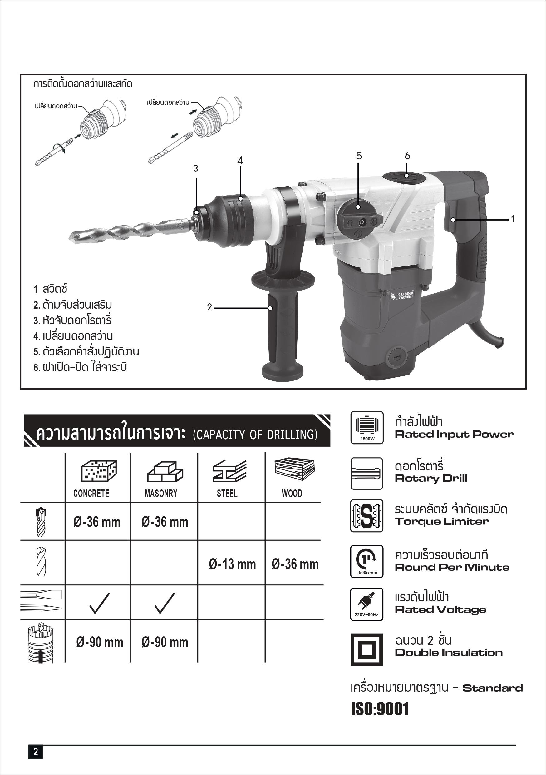 - สว่านโรตารี่ 10 จูล กำลังไฟฟ้าเต็ม 1500W ความเร็วรอบสูงถึงรอบ 500/นาที อัตราการกระแทกที่ 4000ครั้ง/นาที