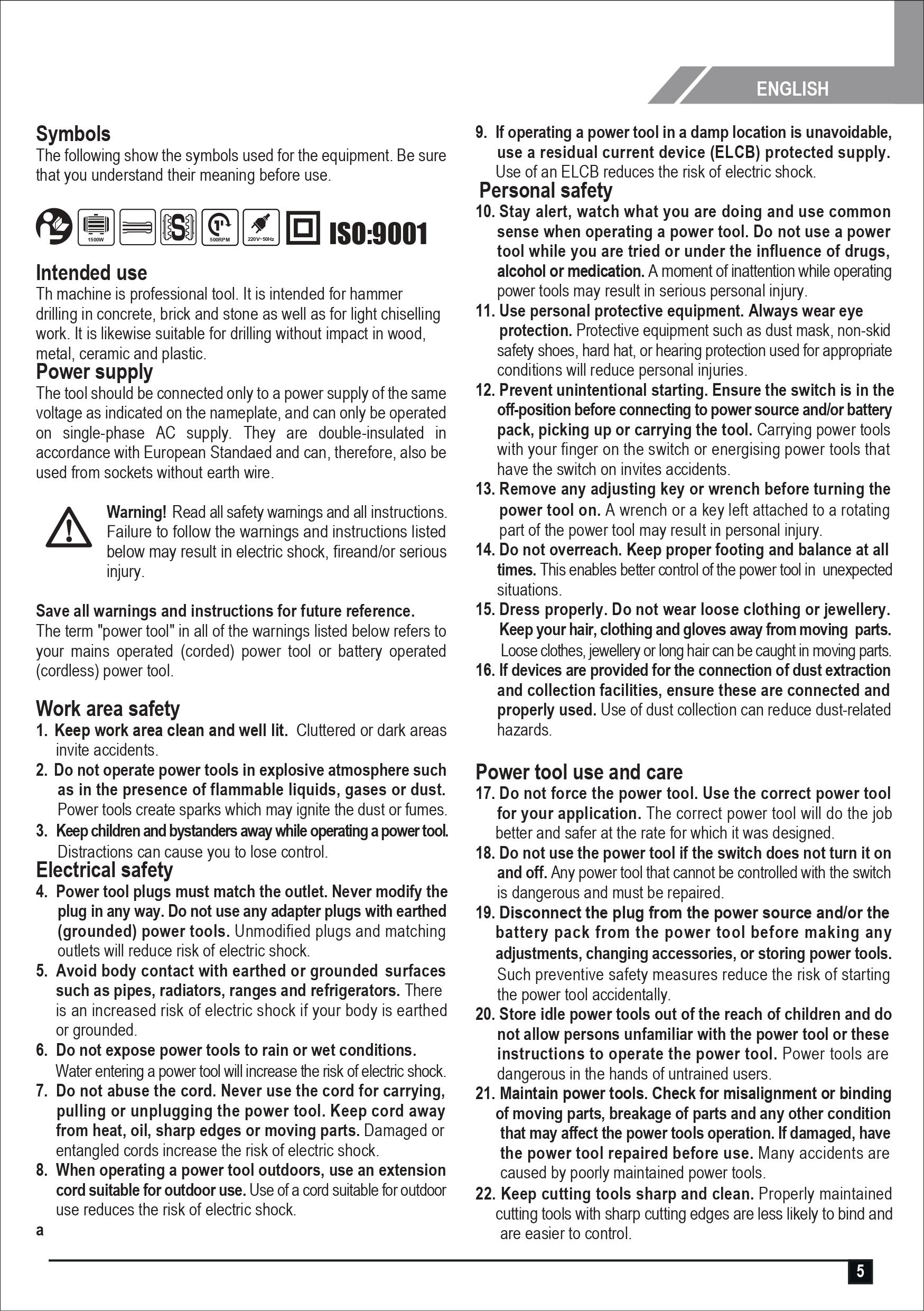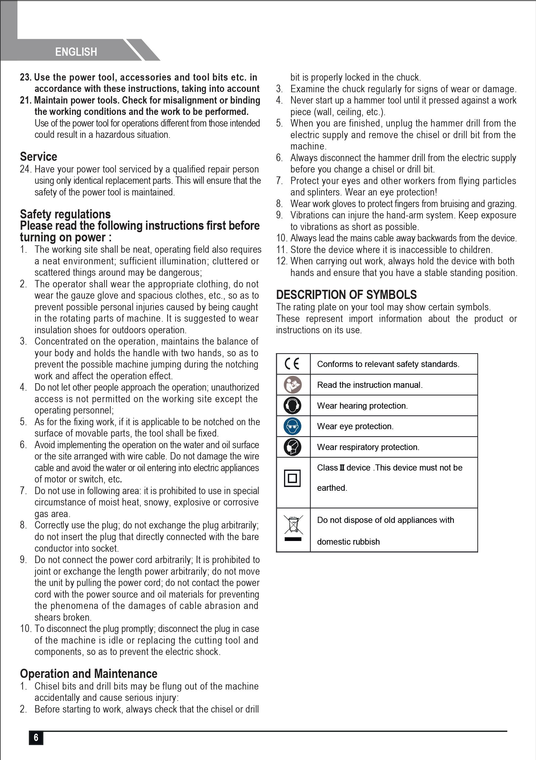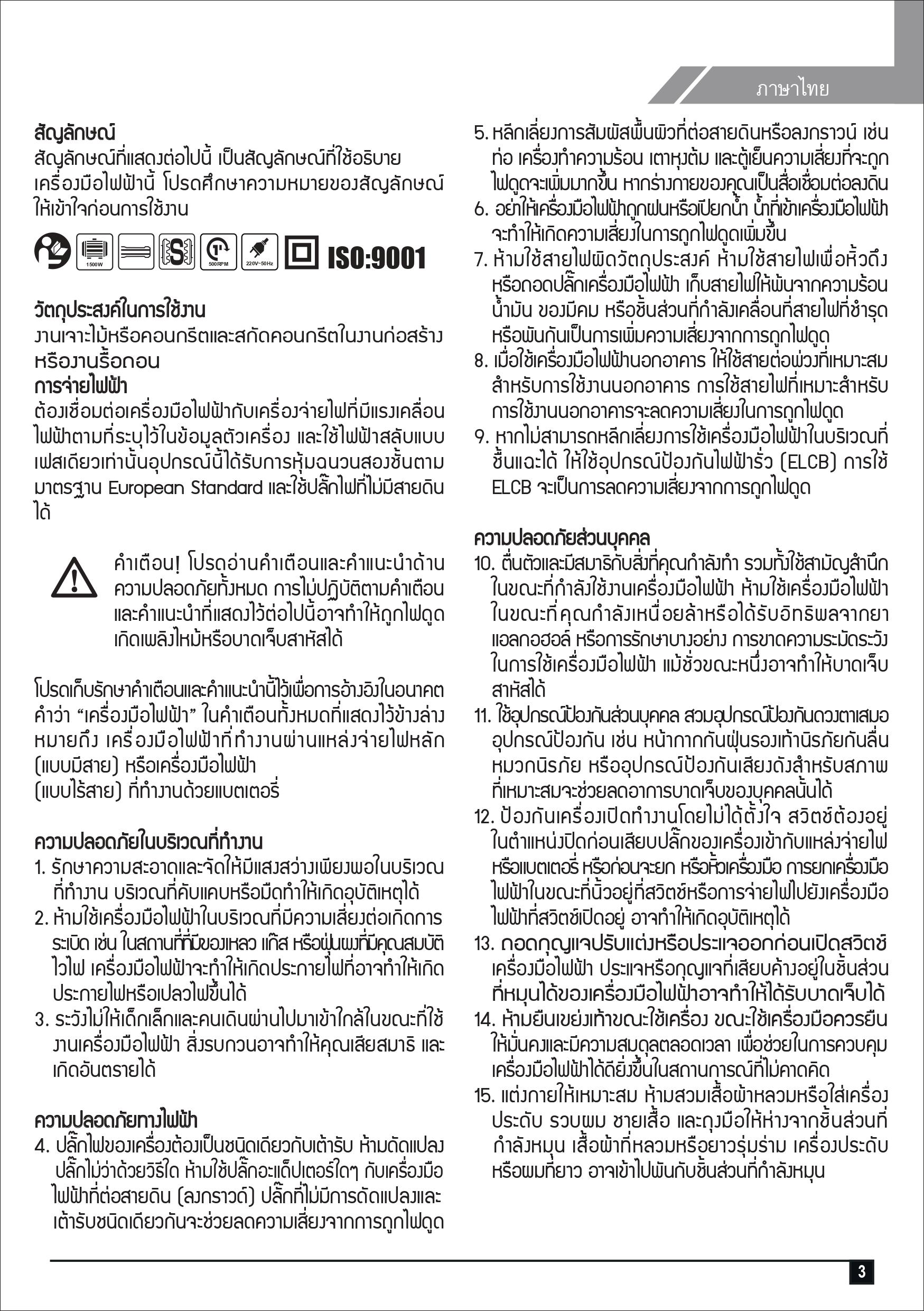 (Before every operation, make sure that every step of the equipment is ready for use with no signs of damage.) - สวมใส่อุปกรณ์เพื่อความปลอดภัย เช่น หน้ากากหรือแว่นตากันสเก็ด ถุงมือหนัง อุปกรณ์ป้องกันเสียงดัง เพื่อป้องกันอันตรายที่เกิดจากการใช้งาน