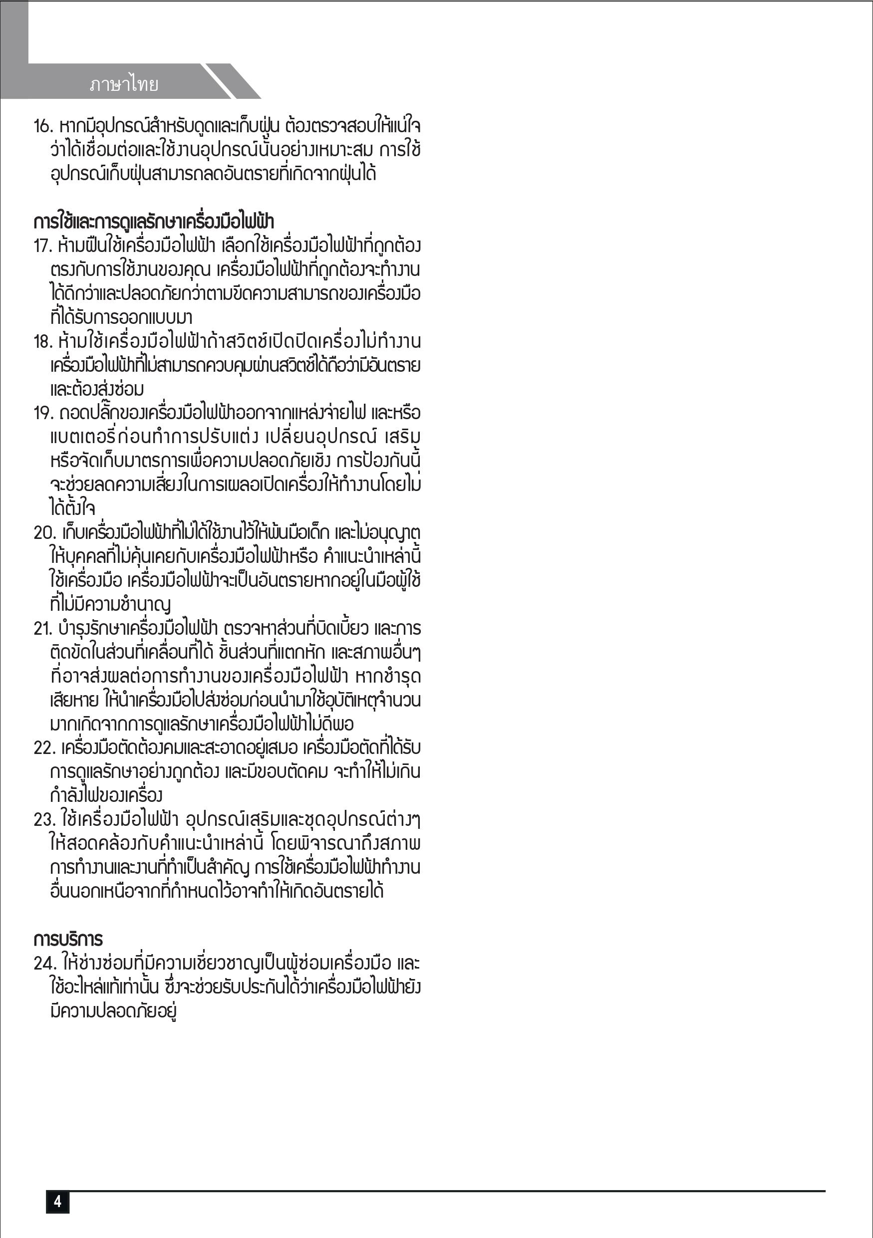 (Wear safety equipment such as a mask or goggles, leather gloves, and noise canceling devices. to prevent harm caused by use.) - ไม่ใช้งานใกล้สายไวไฟโดยเด็ดขาด (Never use near flammable cables.)