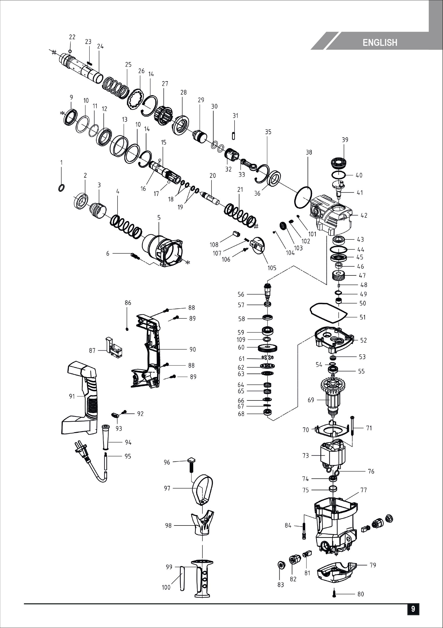(The rotary hammer has 2 functions: hammer drilling for masonry drilling and chiseling for demolition of tiled floors, masonry floors, small poles, etc.) - ระบบโอเวอร์คลัชป้องกันผู้ใช้งานได้รับบาดเจ็บ และป้องกันเครื่องมือเสียหายในกรณีดอกสว่านหรือดอกสกัดติดขัดบนชิ้นงาน ระบบโอเวอร์คลัชจะทำงานที่ 40-45 N.m