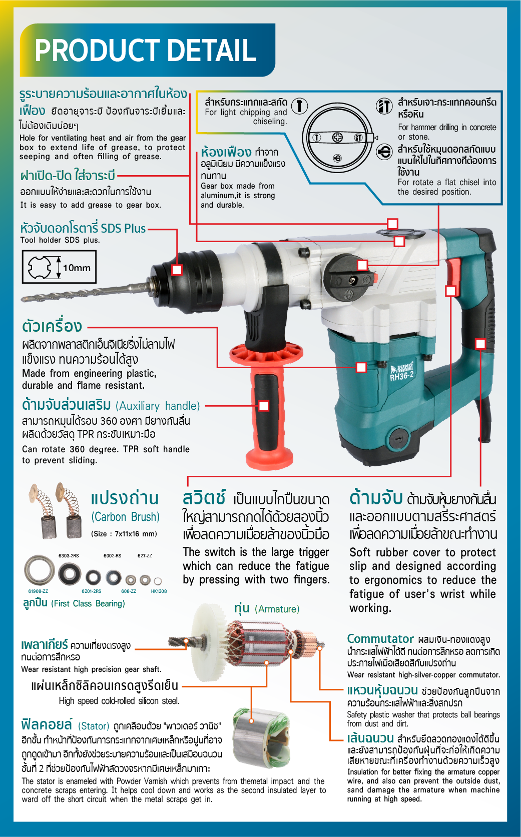 (Overclutching system prevents user injury. and prevent tool damage in the event of a drill or chisel stuck on the workpiece. The overclutch system operates at 40-45 N.m.) - ภายในตัวเครื่องของ สว่านโรตารี่ 10 จูล มีระบบเฟืองคู่ขนานป้องกันการสึกหรอและความเสียหายของเฟือง ช่วยยืดอายุการใช้งานของเครื่องมือ