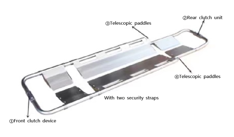 - Stretcher separation: The two ends of the stretcher are equipped with a clutching device. Pressing the clutching device buttons on ① and ② on both ends of the stretcher at the same time can separate the stretcher into two parts.