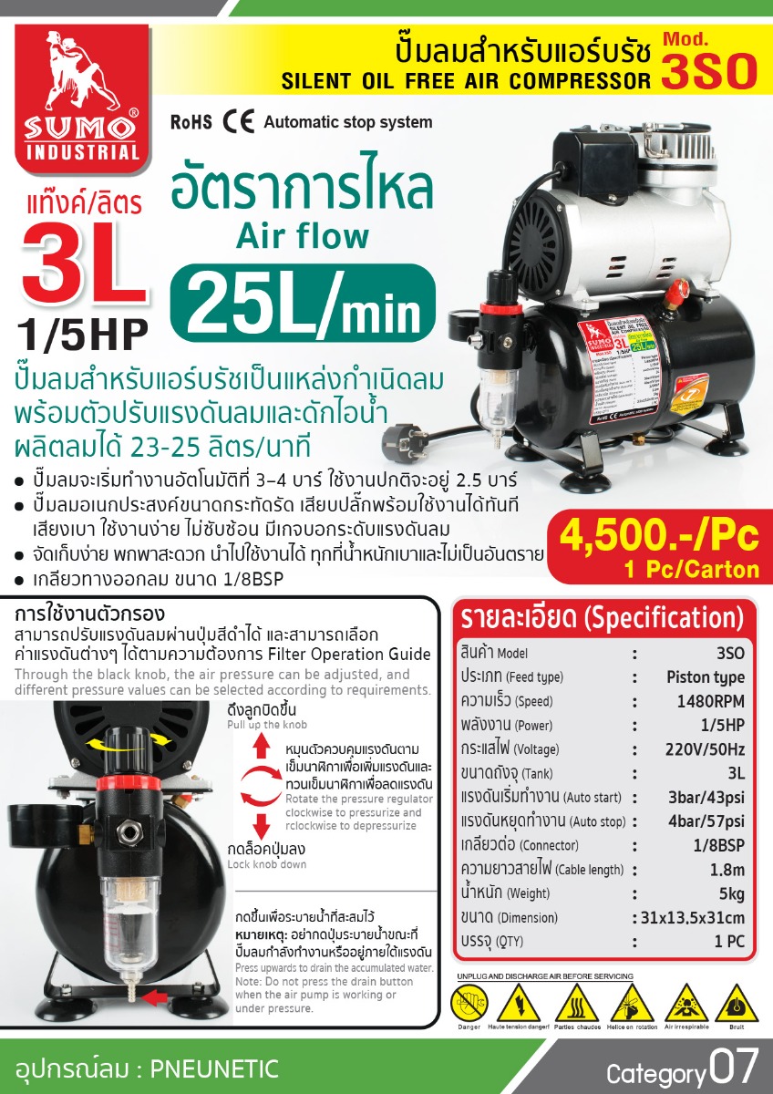 ปั๊มลมสำหรับแอร์บรัช 1/5HP (3L) รุ่น 3SO