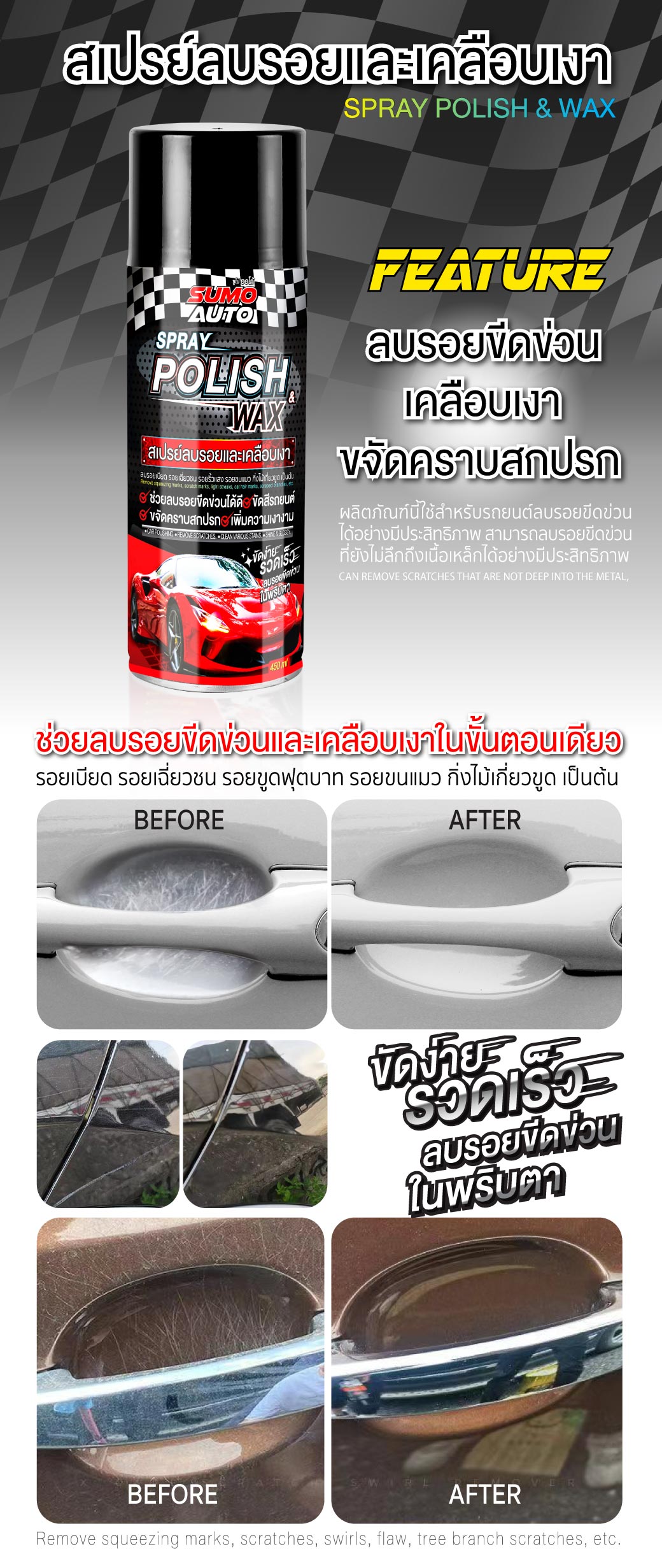 สเปรย์ลบรอยและเคลือบเงา สามารถลบรอยขีดข่วนที่ยังไม่ลึกถึงเนื้อเหล็กได้อย่างมีประสิทธิภาพ เช่น รอยเบียด รอยเฉี่ยวชน รอยขูดฟุตบาท รอยขนแมว กิ่งไม้เกี่ยวขูด เป็นต้น