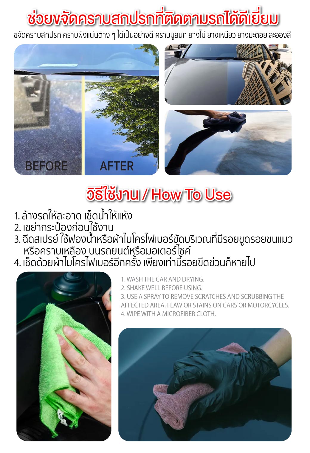 - ฉีด สเปรย์ลบรอยและเคลือบเงา ใช้ฟองน้ำหรือผ้าไมโครไฟเบอร์ขัดบริเวณที่มีรอยขูด รอยขนแมว หรือคราบเหลืองบนรถยนต์หรือมอเตอร์ไซค์