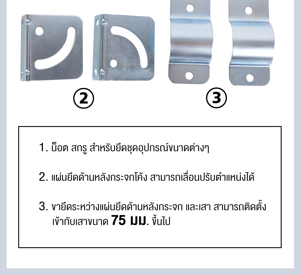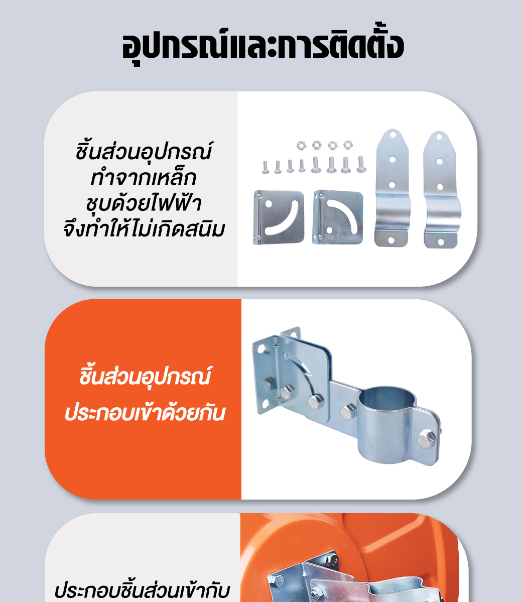 มีขาจับสำหรับติดตั้ง ทำจากเหล็กชุบด้วยไฟฟ้าจึงทำให้ไม่เกิดสนิม มีความแข็งแรงสูงและยึดจับได้ดี ทนต่อทุกสภาพแวดล้อม ติดตั้งง่าย