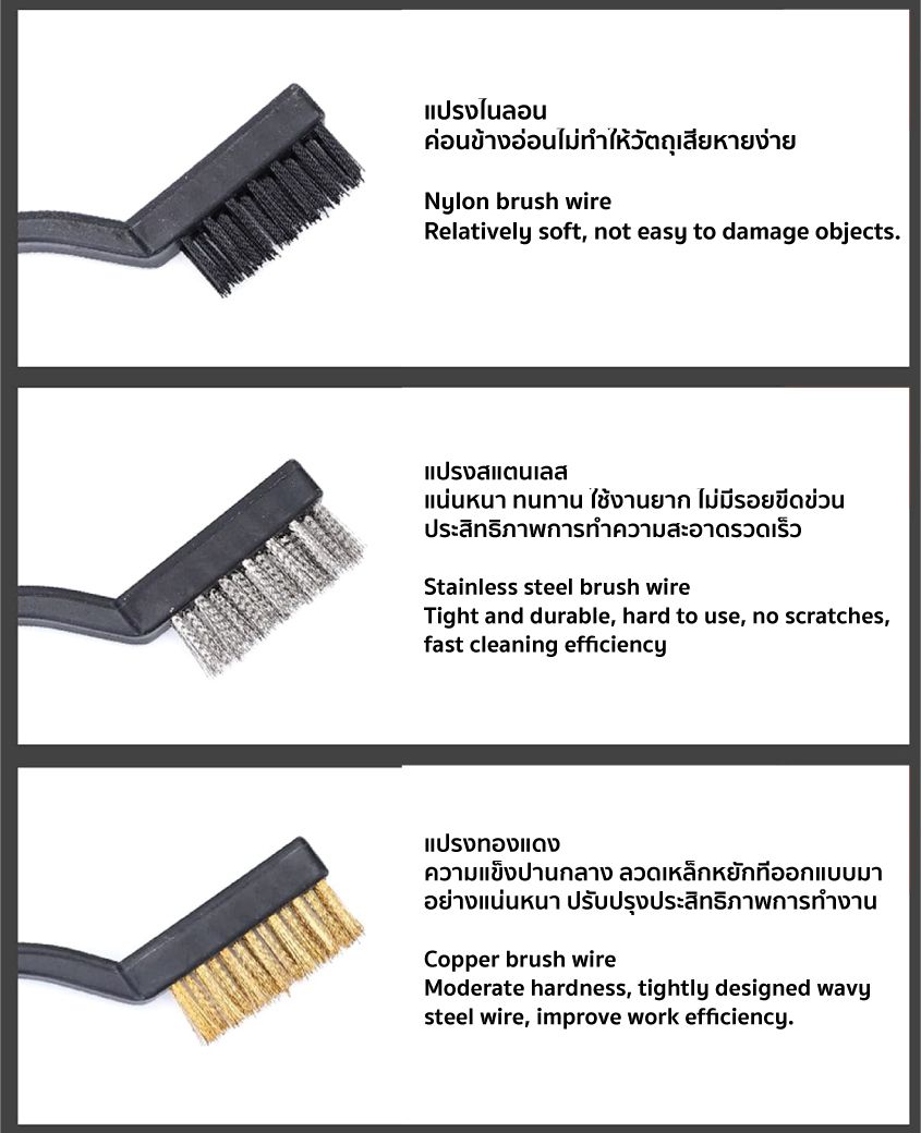 - แปรง 3 ชิ้น ขนแปรงทำจากวัสดุที่แตกต่างกันสามชนิด สเตนเลส/ไนลอน/ทองเหลือง วัสดุที่แตกต่างกัน การใช้งานที่แตกต่างกัน